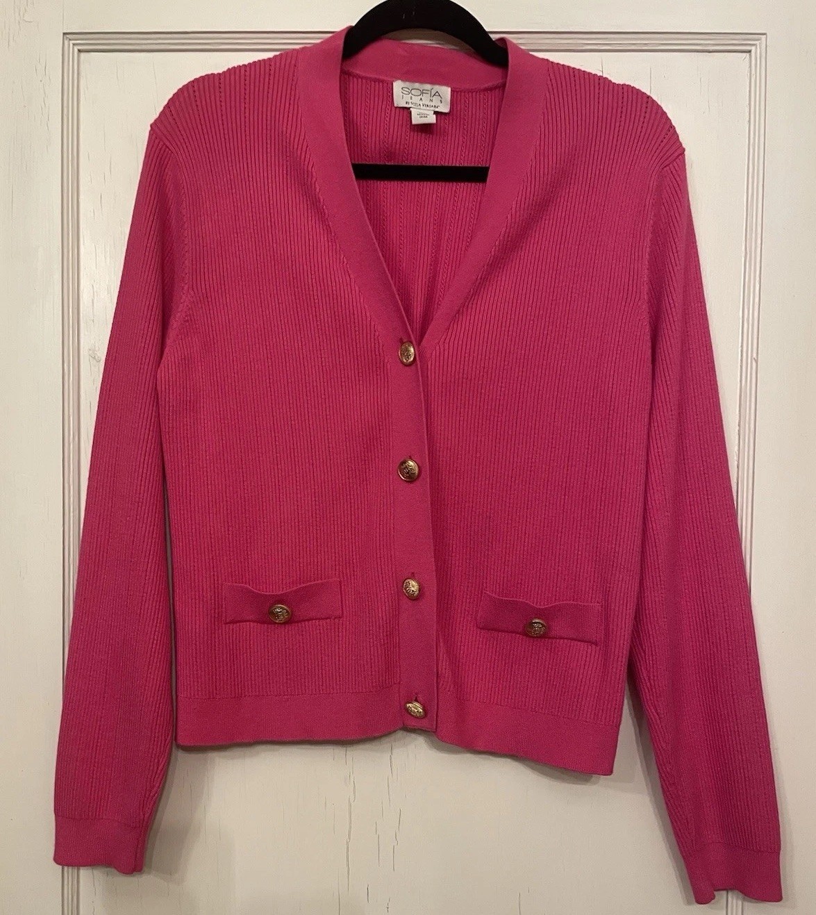 как выглядит Sofia Vergara Womens Cardigan XXL Hot Pink Knit Sweater Pockets Gold Buttons фото