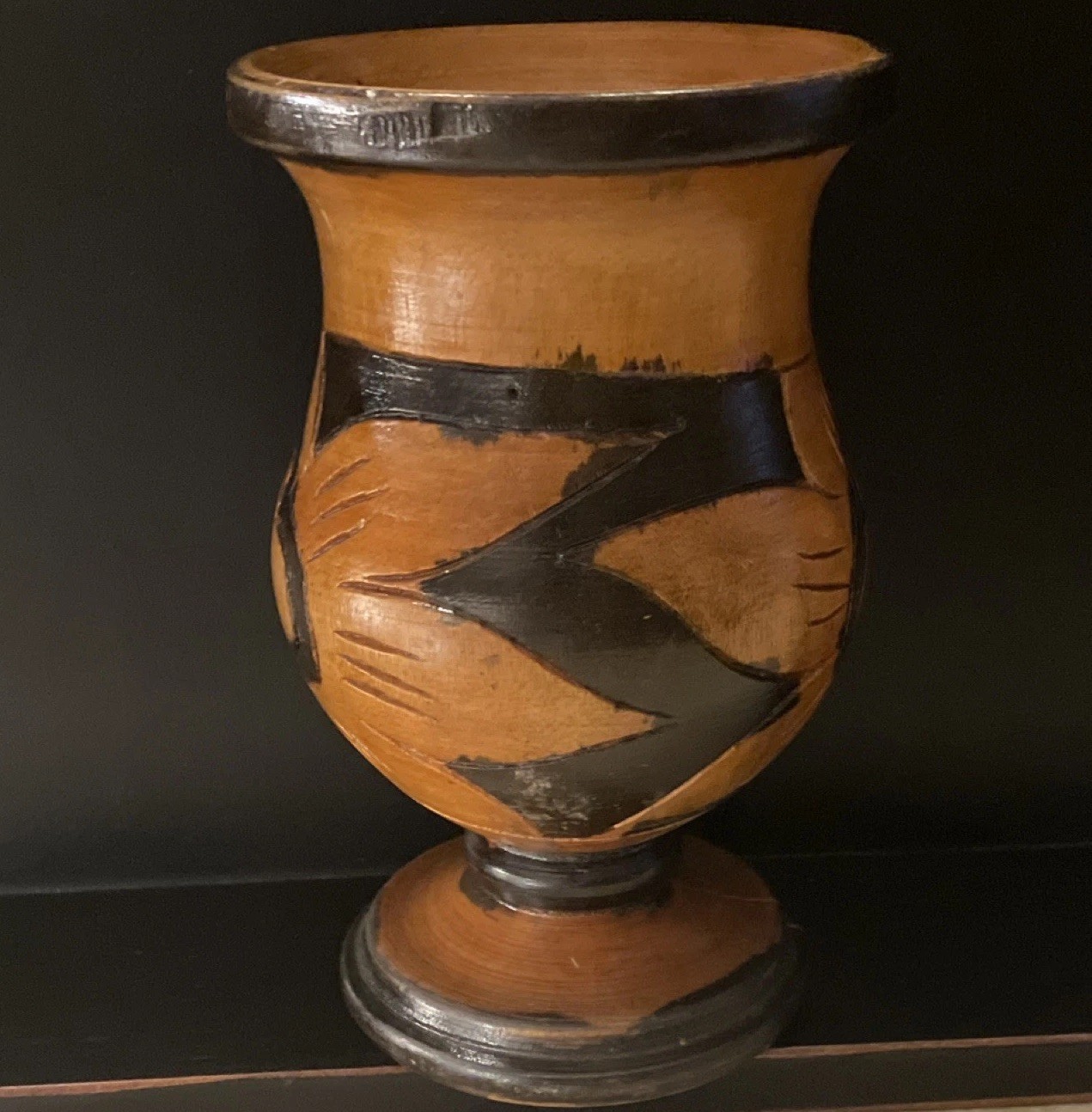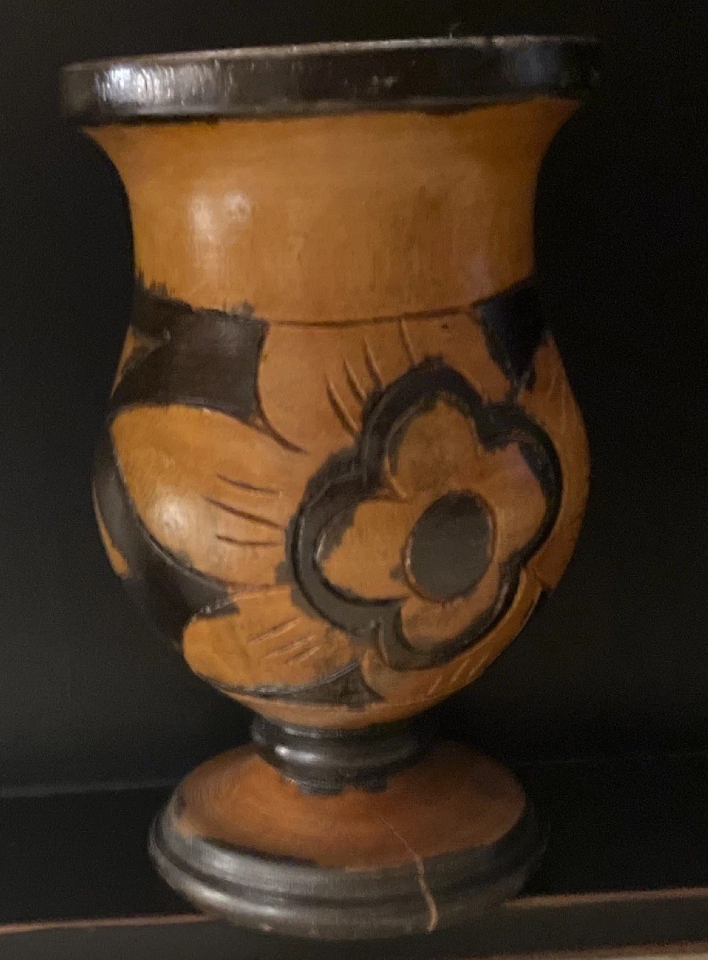 Vintage 6 x 3.75 Handmade Wooden Vase with Floral Carving Design
