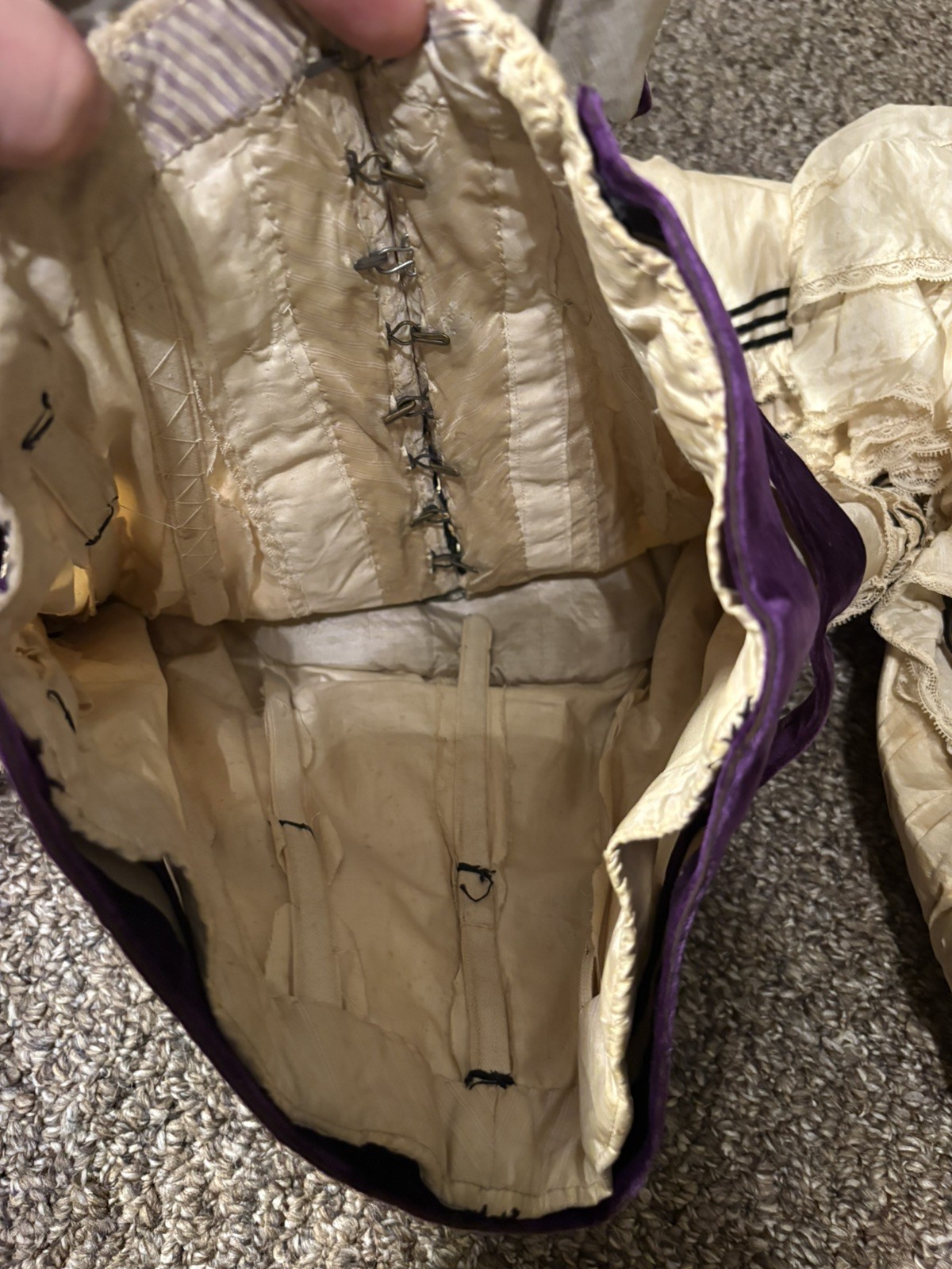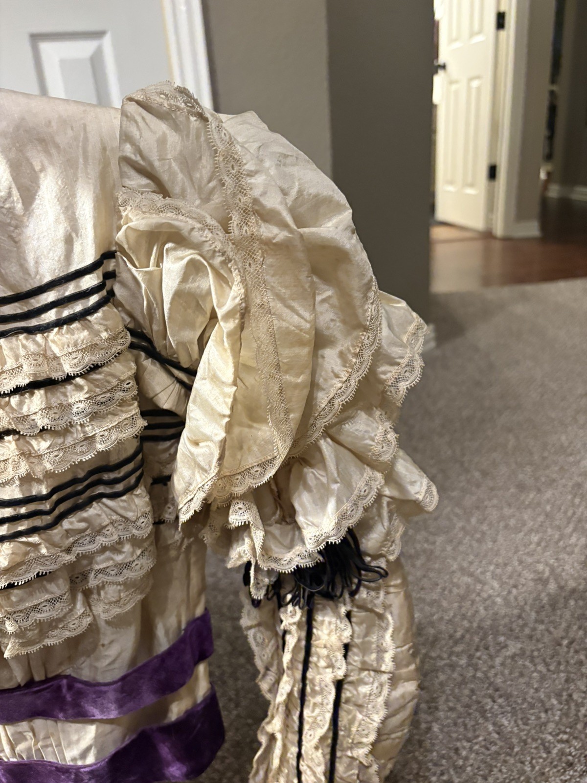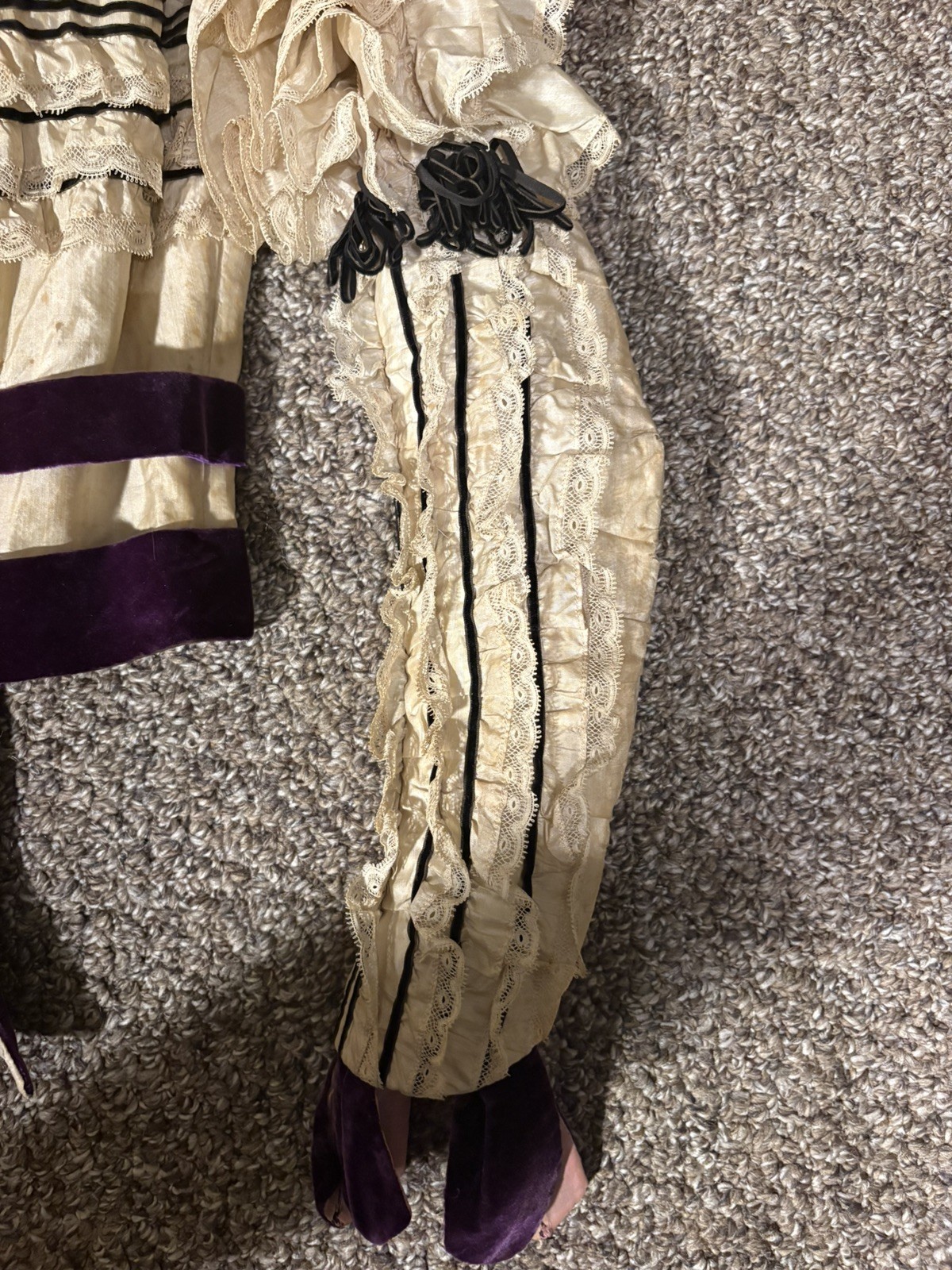 как выглядит Antique Victorian Cream Silk Bodice Purple Velvet Leg o Mutton Ruffles Lace фото
