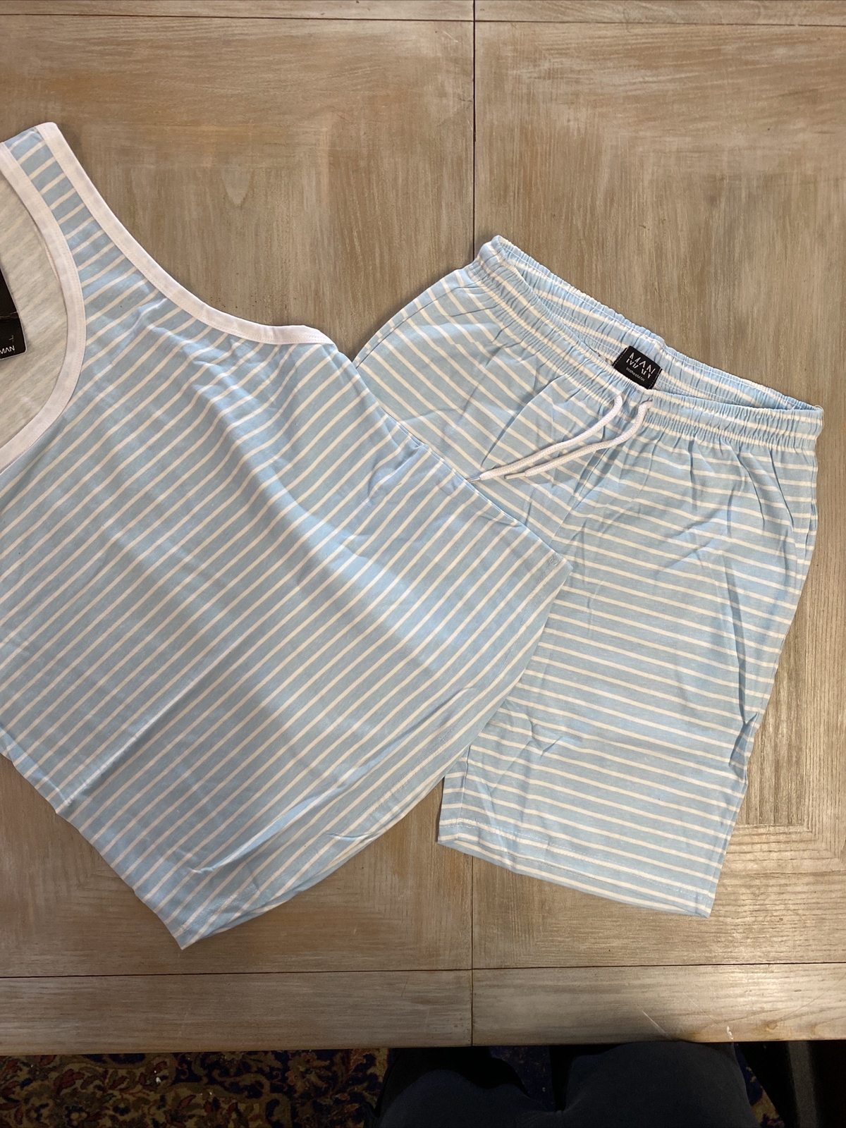 как выглядит Mens Vest Shorts Set Medium Blue White Boohoo Man Set RRP 35 фото