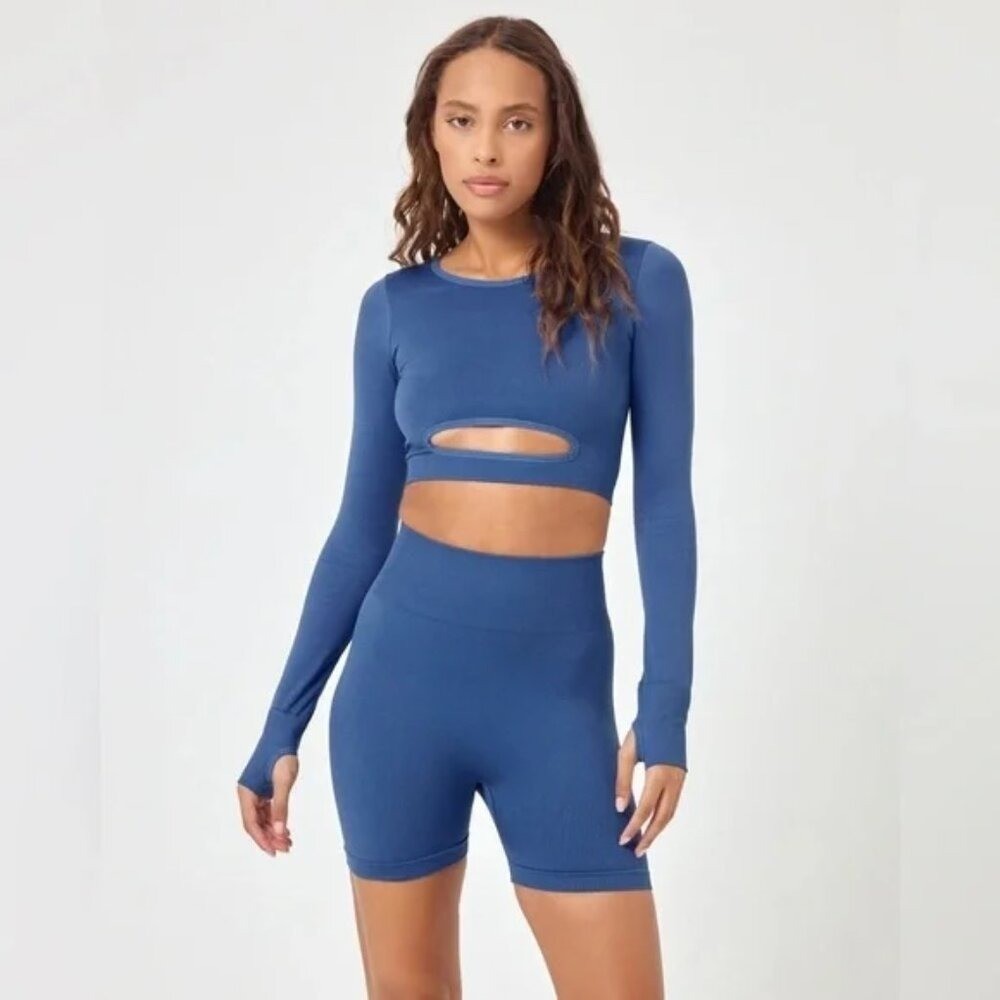 NWT 163 L SPACE In The Zone 2-PIECE SET Bike Shorts Cutout Crop Top Blue M/L