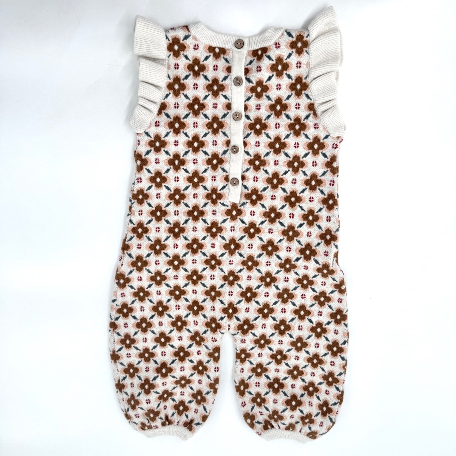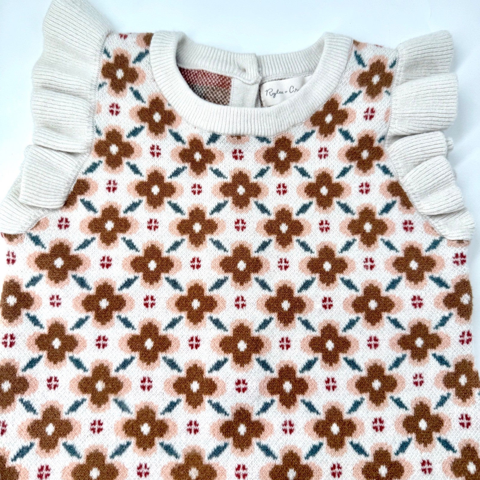 Rylee Cru Kids Floral Knit Romper Ruffle Shoulder Button Back 12-18M Cream