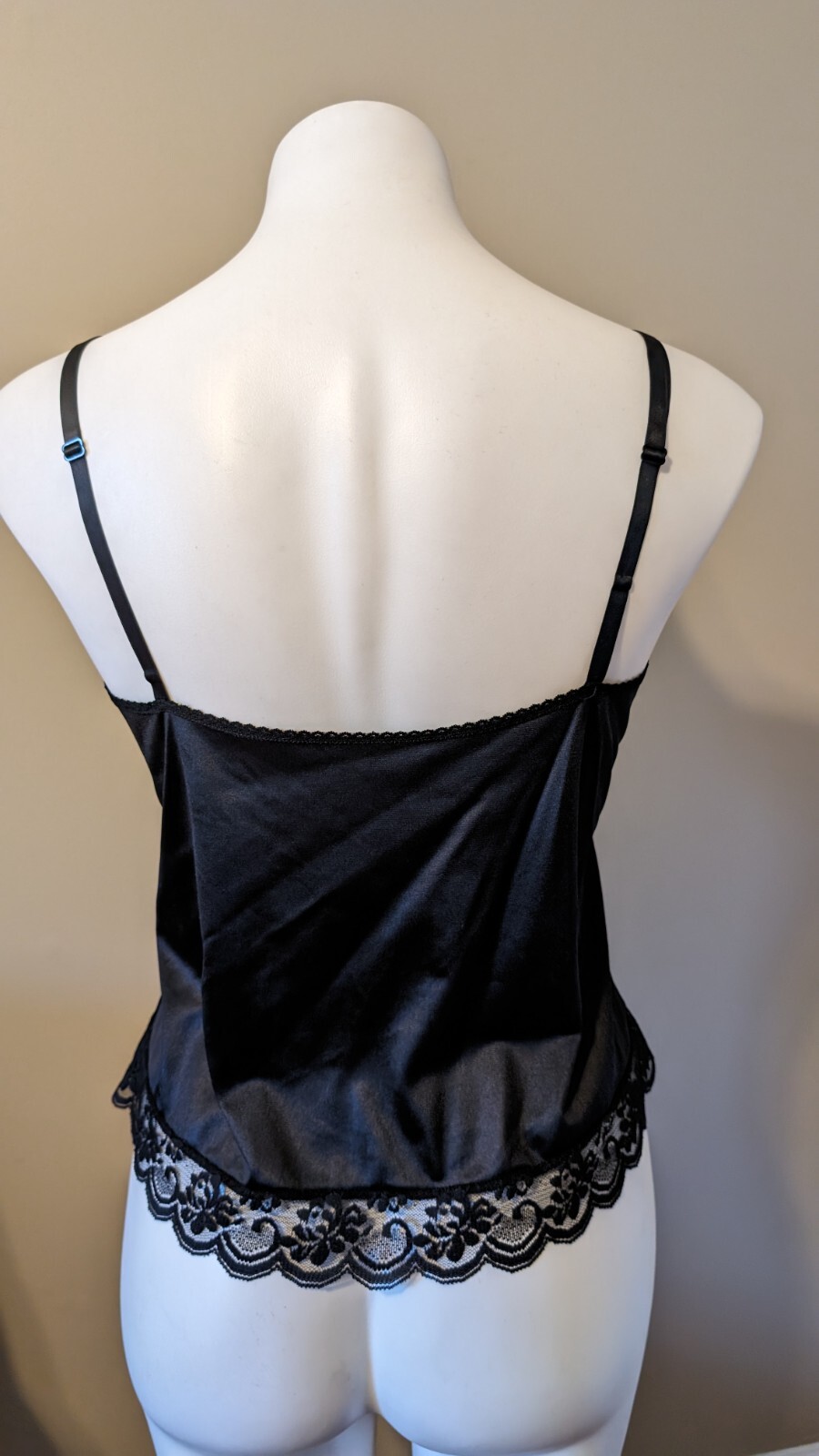 Vintage JCPenney Fantasia Shiny Black Satin w/Sheer Floral Lace Camisole Top 34