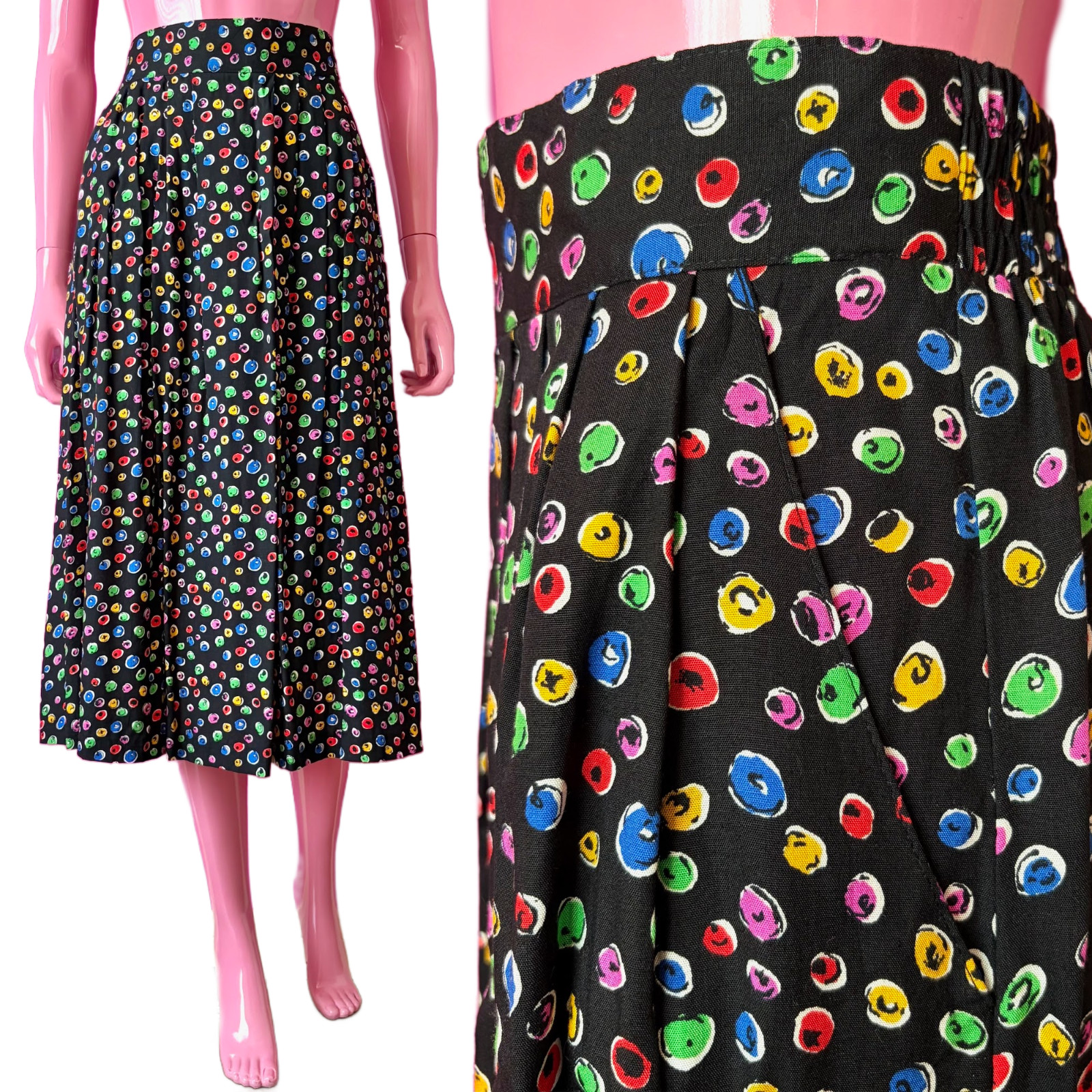 Vintage 80s/90s 22 2-Piece Set Matching Blazer Midi Skirt Black Colorful Circles