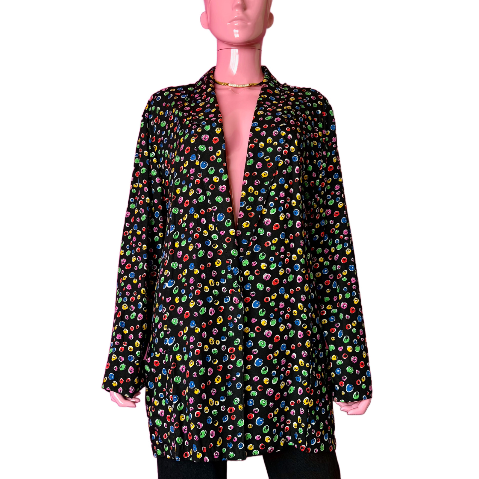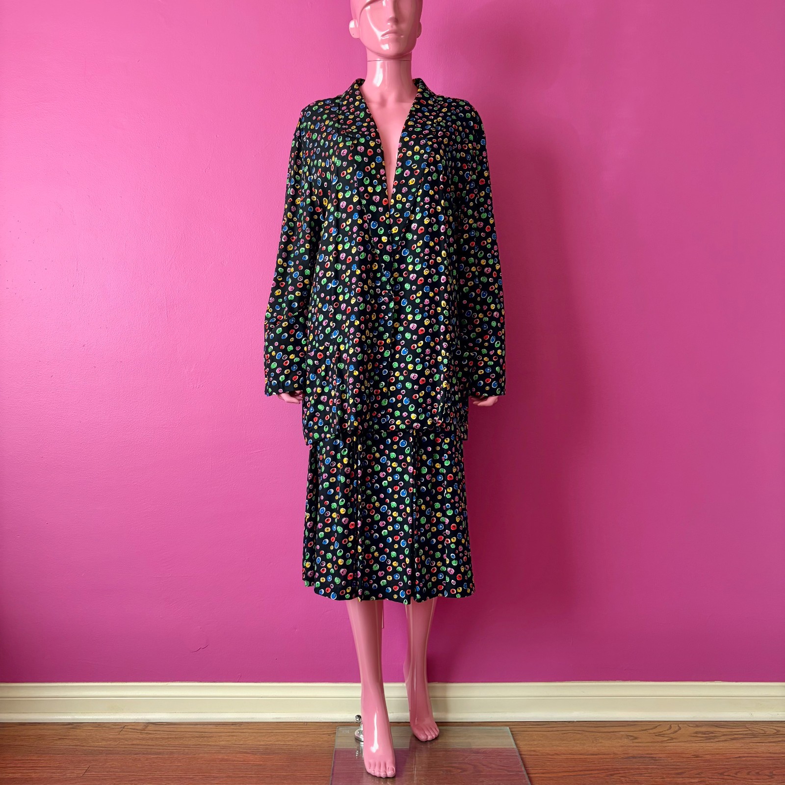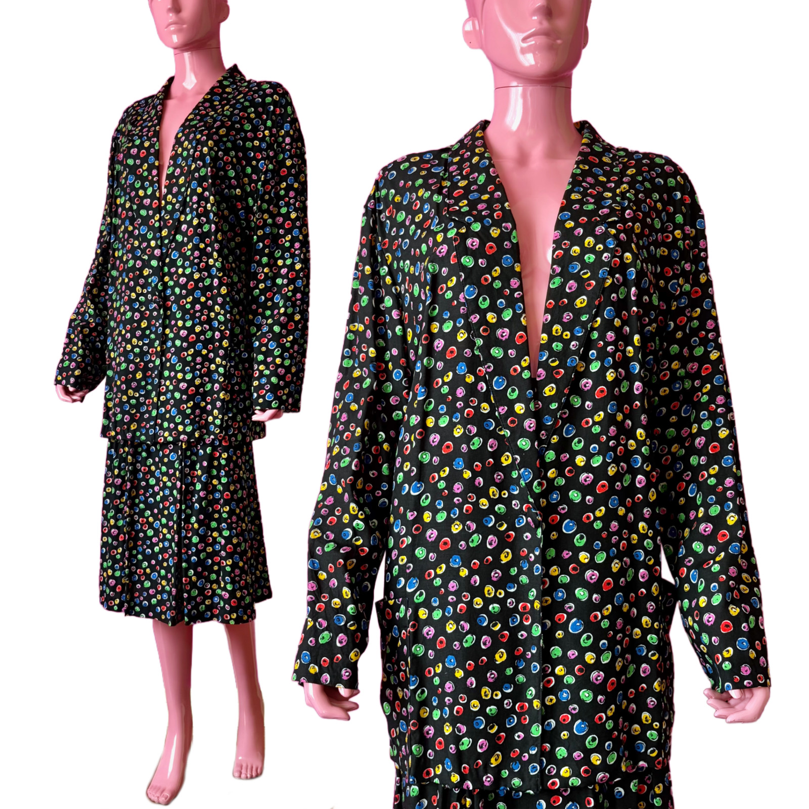 как выглядит Vintage 80s/90s 22 2-Piece Set Matching Blazer Midi Skirt Black Colorful Circles фото