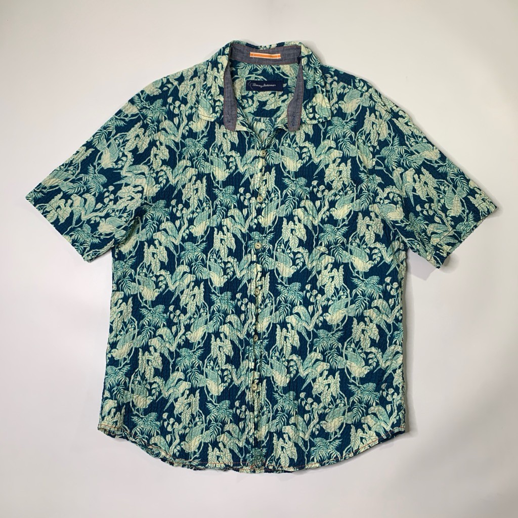 Tommy Bahama Shirt Mens XL Teal Blue Gauzy Tropical Bird Floral Hawaiian Stretch