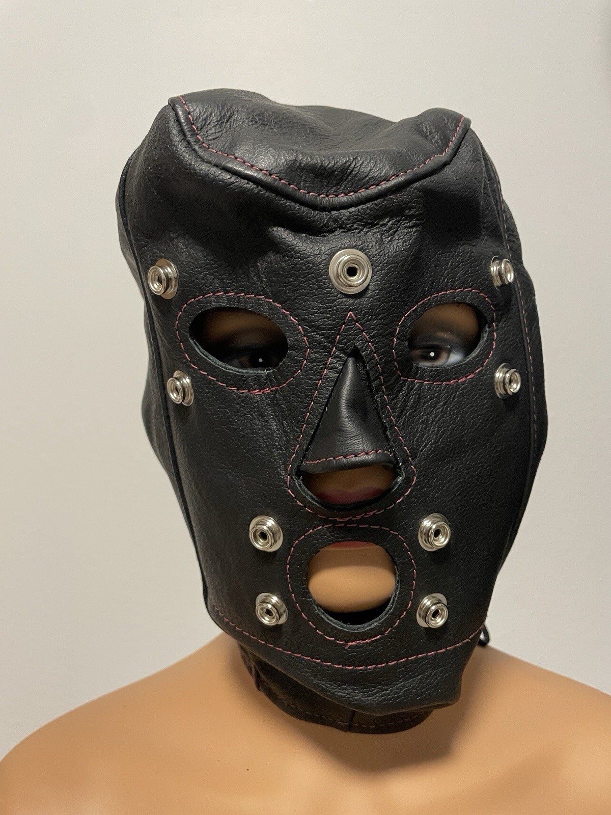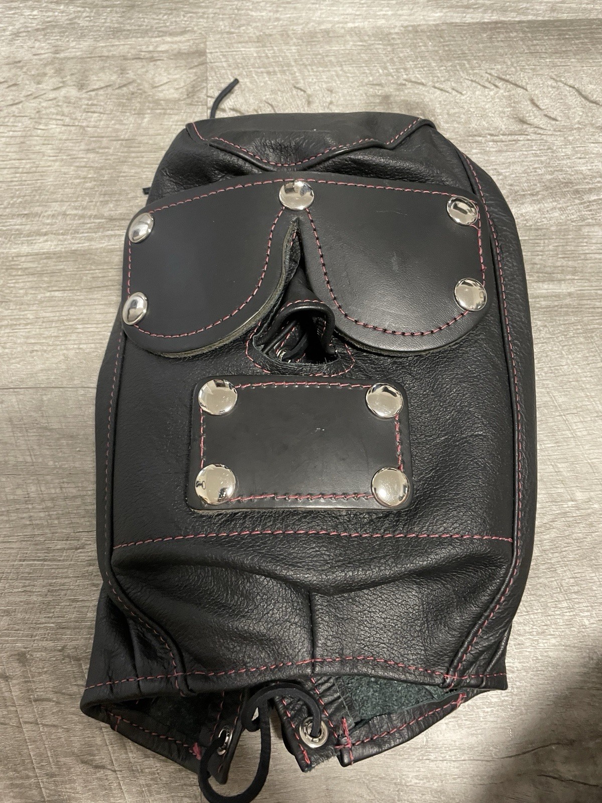 Vintage Leather Hood Padded Snap Blindfold Mask BDSM Red Stitch Med