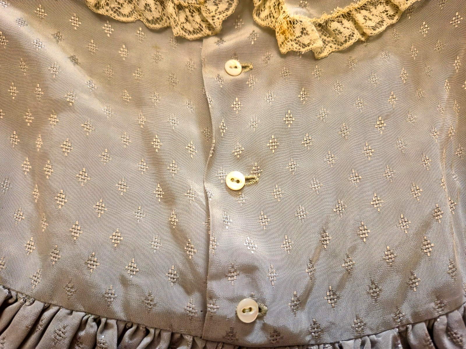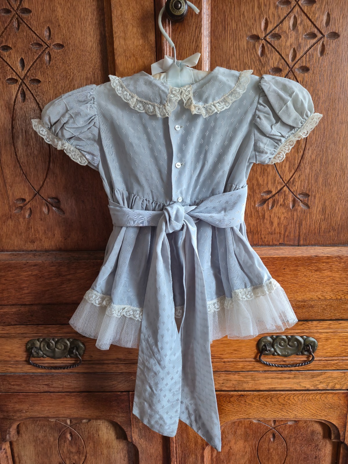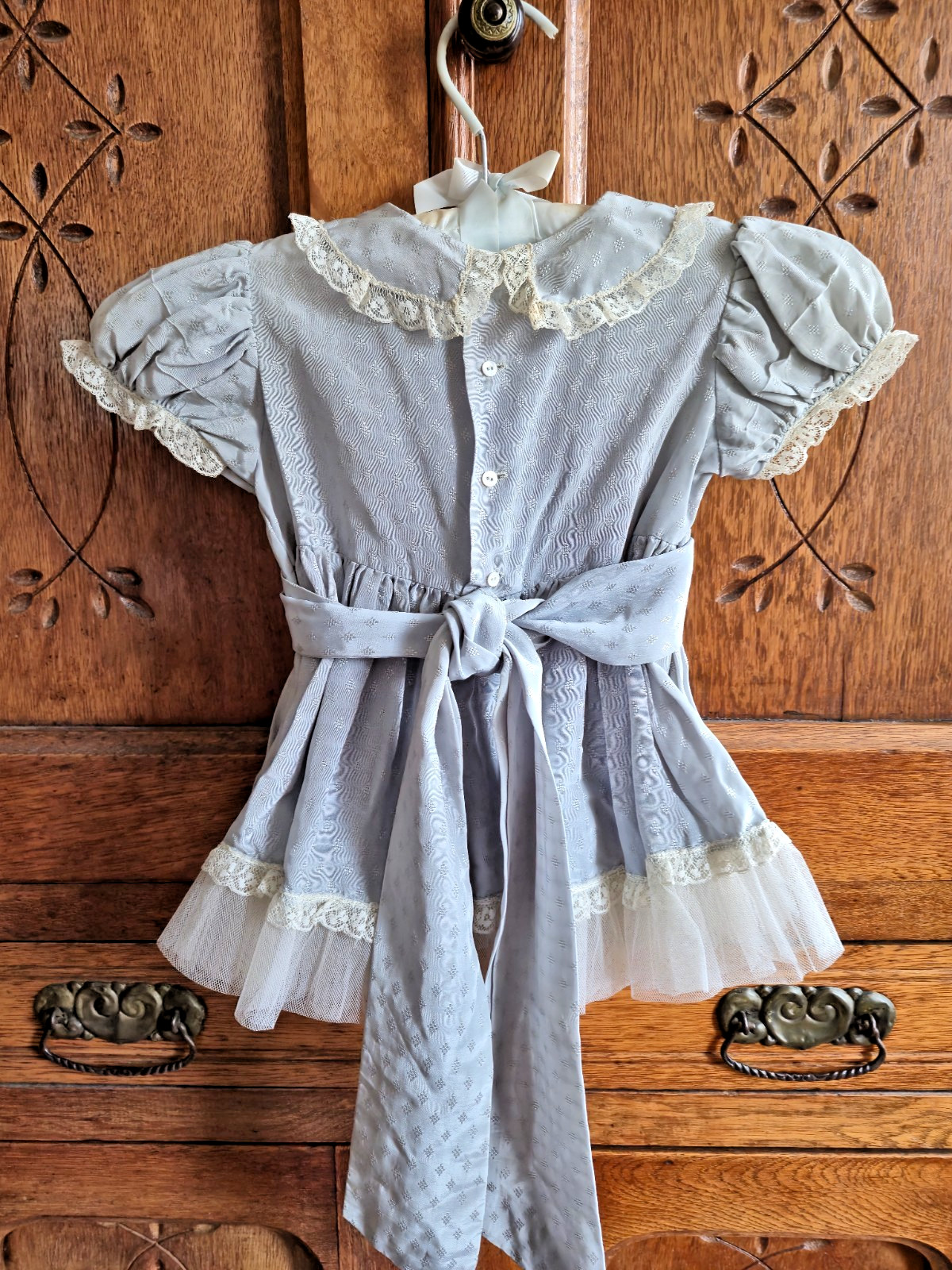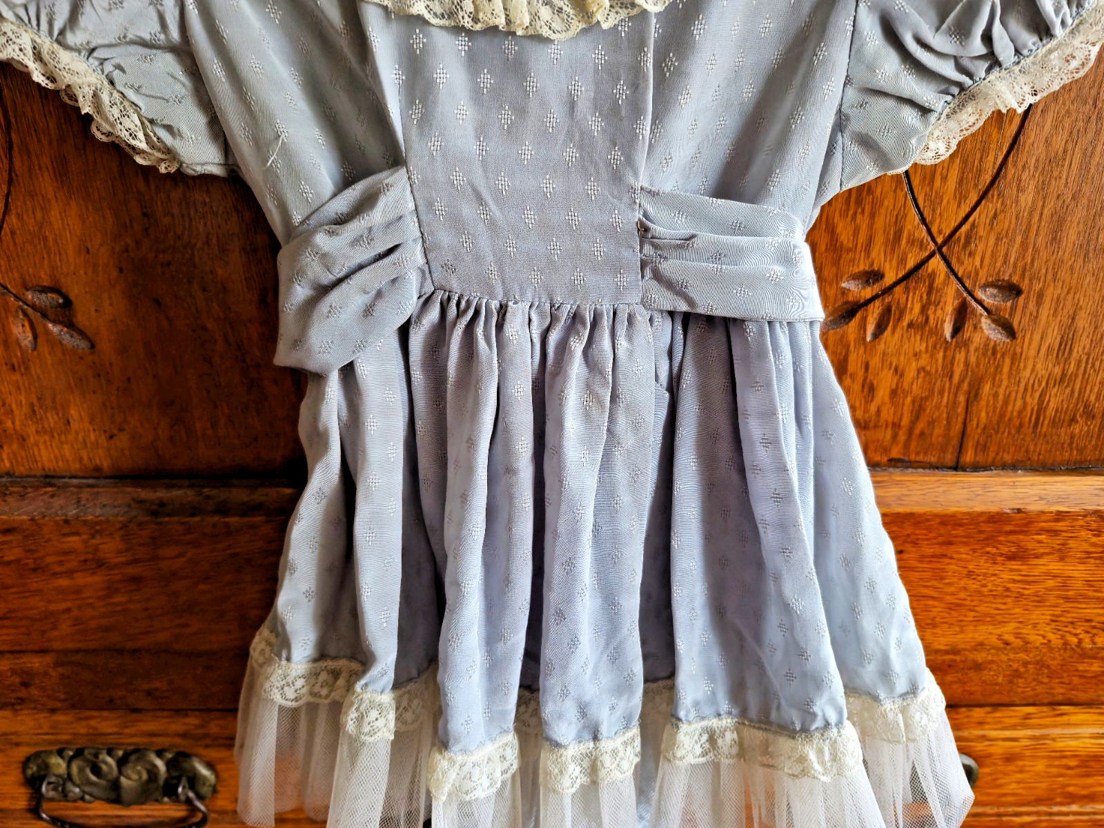 Vtg. 1960s Victorian Style Childs Dress Silk Blue/Gray with Lace Stiff Tulle