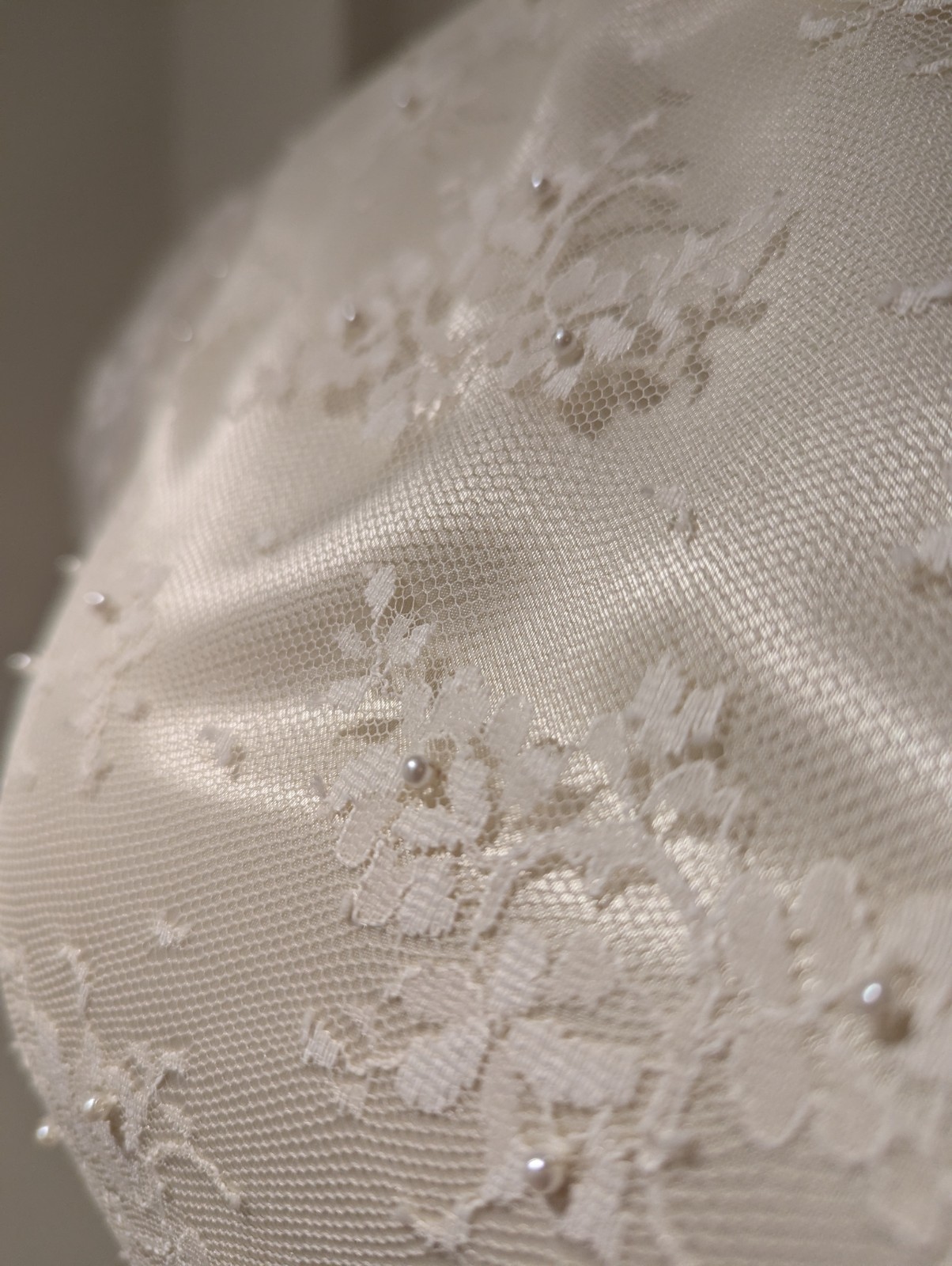 Vintage 1990s Handmade Ivory Wedding Dress Lace Pearl Satin Basque Waist