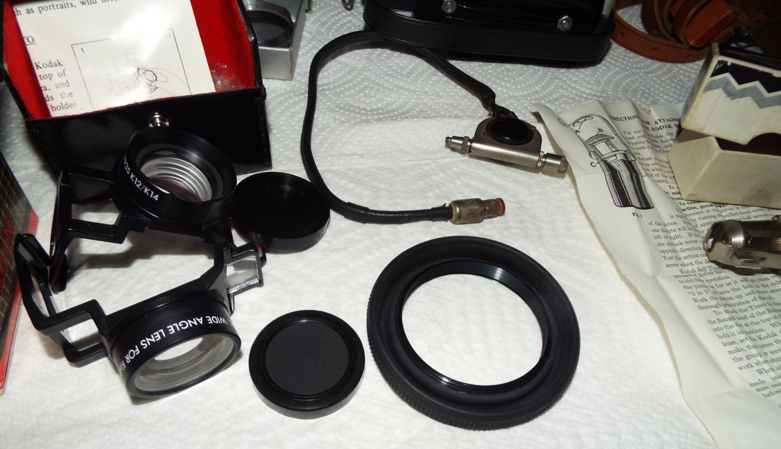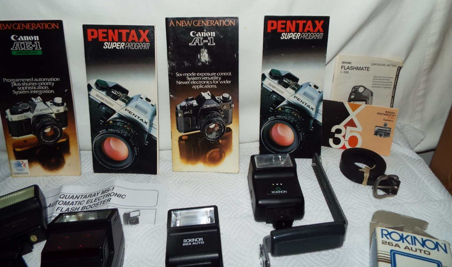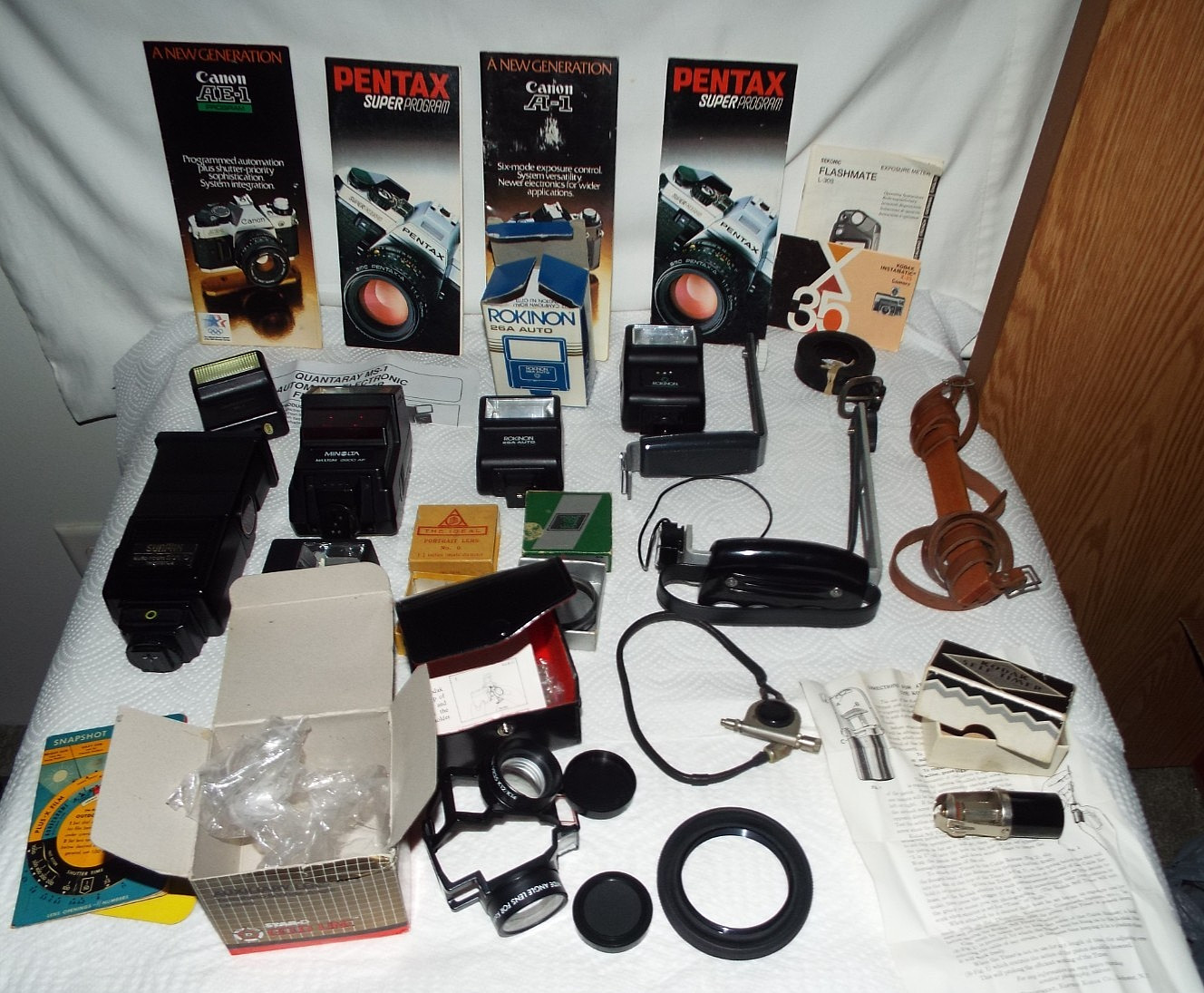 VTG. CAMERA PARTS LOT LENSES, FLASH UNITS, STRAPS, CAMERA BROCHURES ETC... READ
