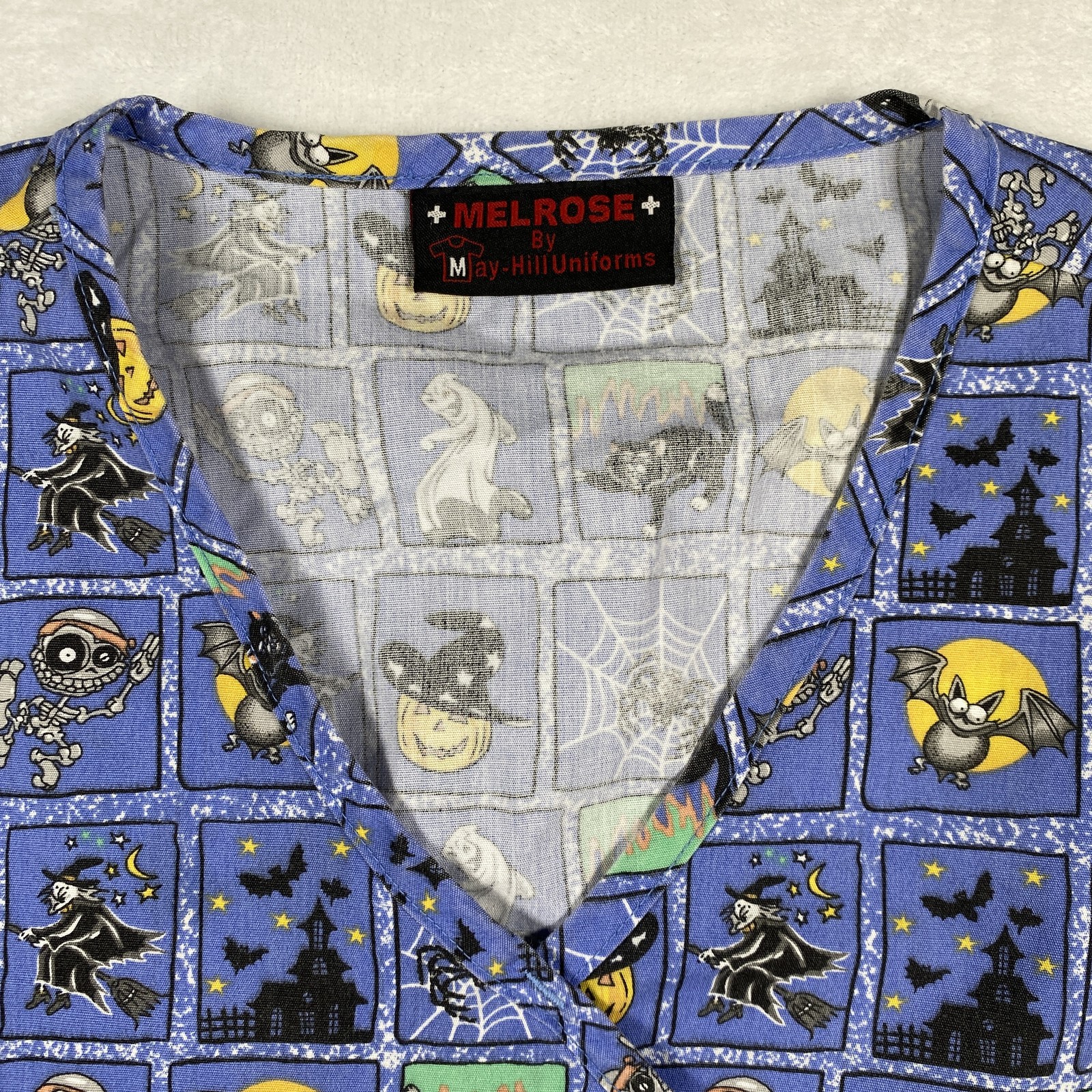 Melrose Womens Halloween Scrub Top Blue Size Medium Graphic Cartoon Spooky Print