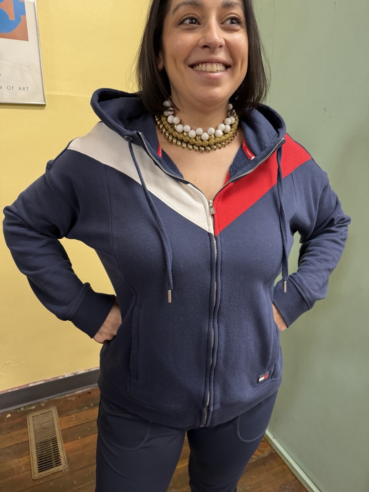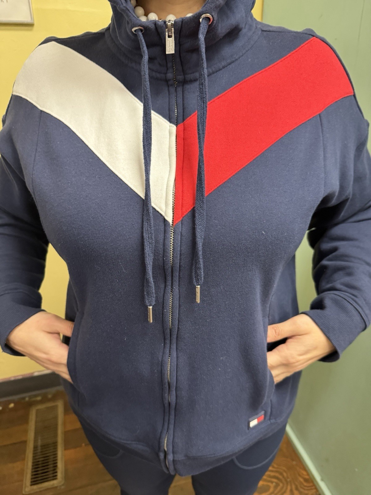 как выглядит Y2K Tommy Hilfiger Sport Velour Chevron Hoodie Sweatshirt Blue Womens XL фото