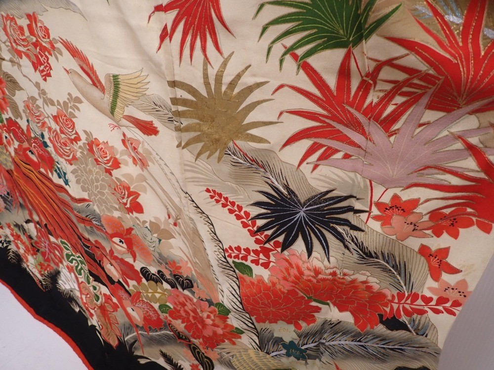• 6210T09z1580 Vintage Japanese Kimono Silk FURISODE Pheasant Off-white