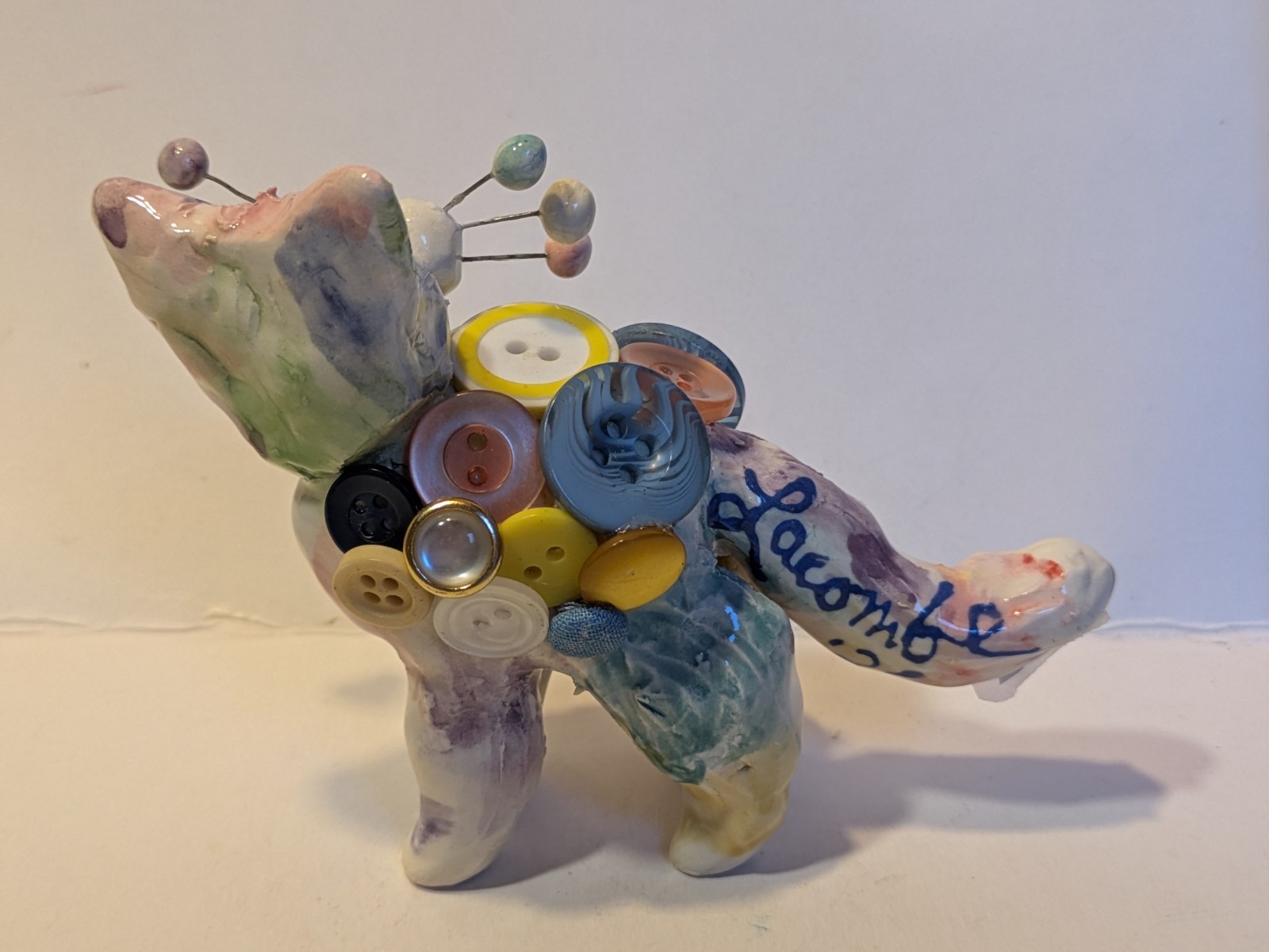 Edy, Cute WhimsiClay Cat Covered In Colorful Buttons. Handmade by Amy Lacombe