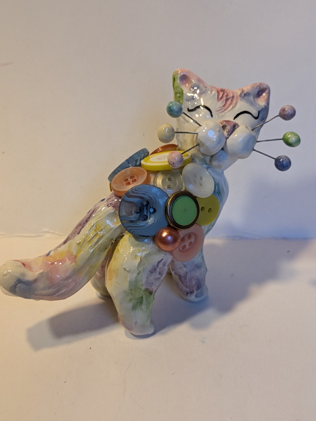 • Edy, Cute WhimsiClay Cat Covered In Colorful Buttons. Handmade by Amy Lacombe