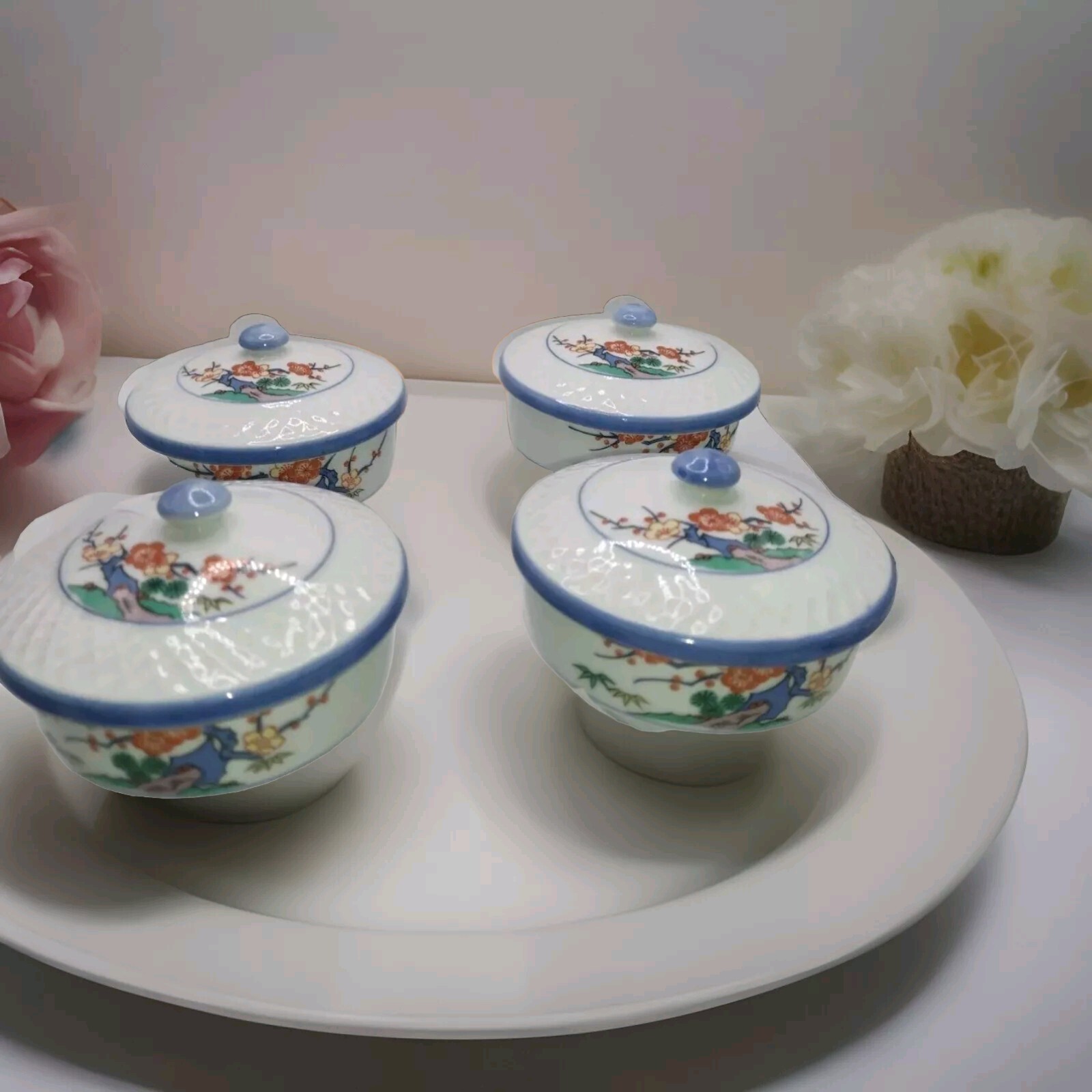 • 4 Vintage Japan Lids Yunomi Tea Cups Handpainted Blue Trimmed Porcelain Signed