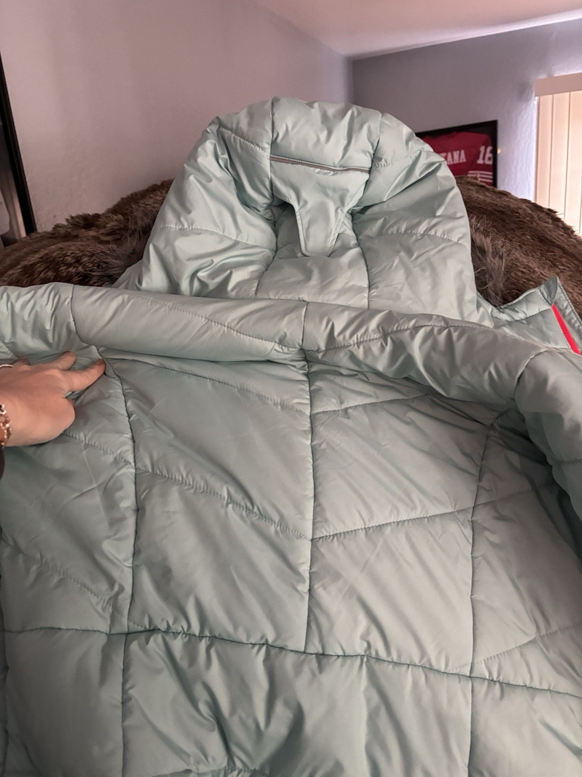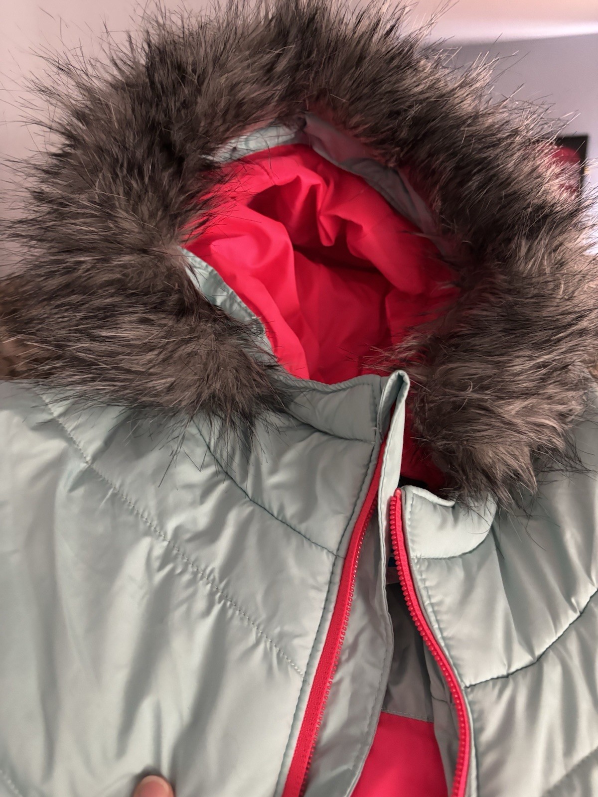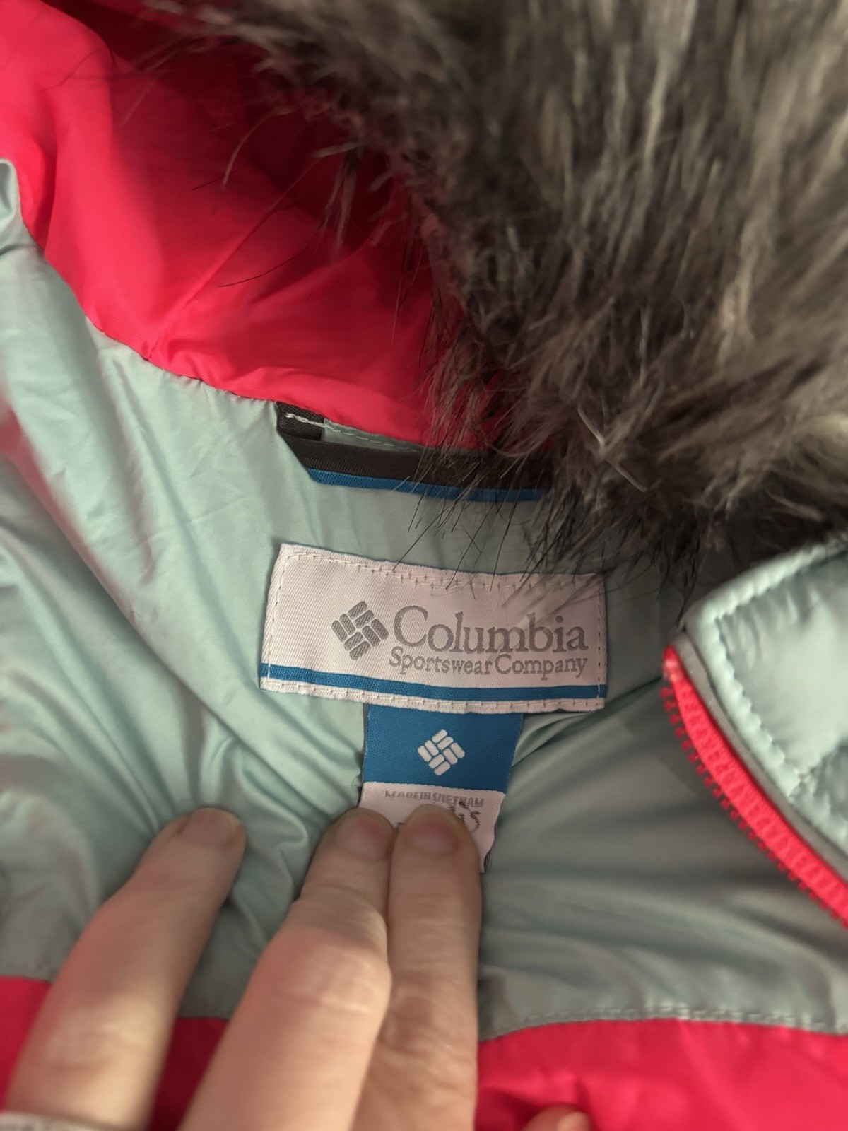 как выглядит Columbia Girls Hooded Puffer Jacket Seafoam W/ Pink Accents Faux Fur Sz XL фото