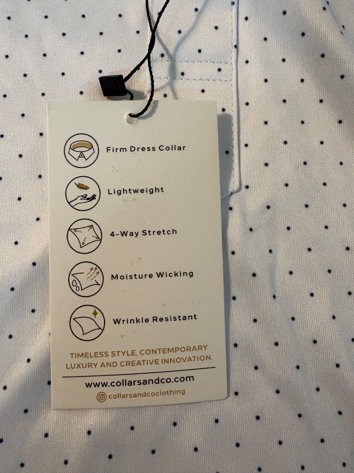 NWT Collars Co Mens Dress Collar Polo Size Large White w/Blue Polka Dots