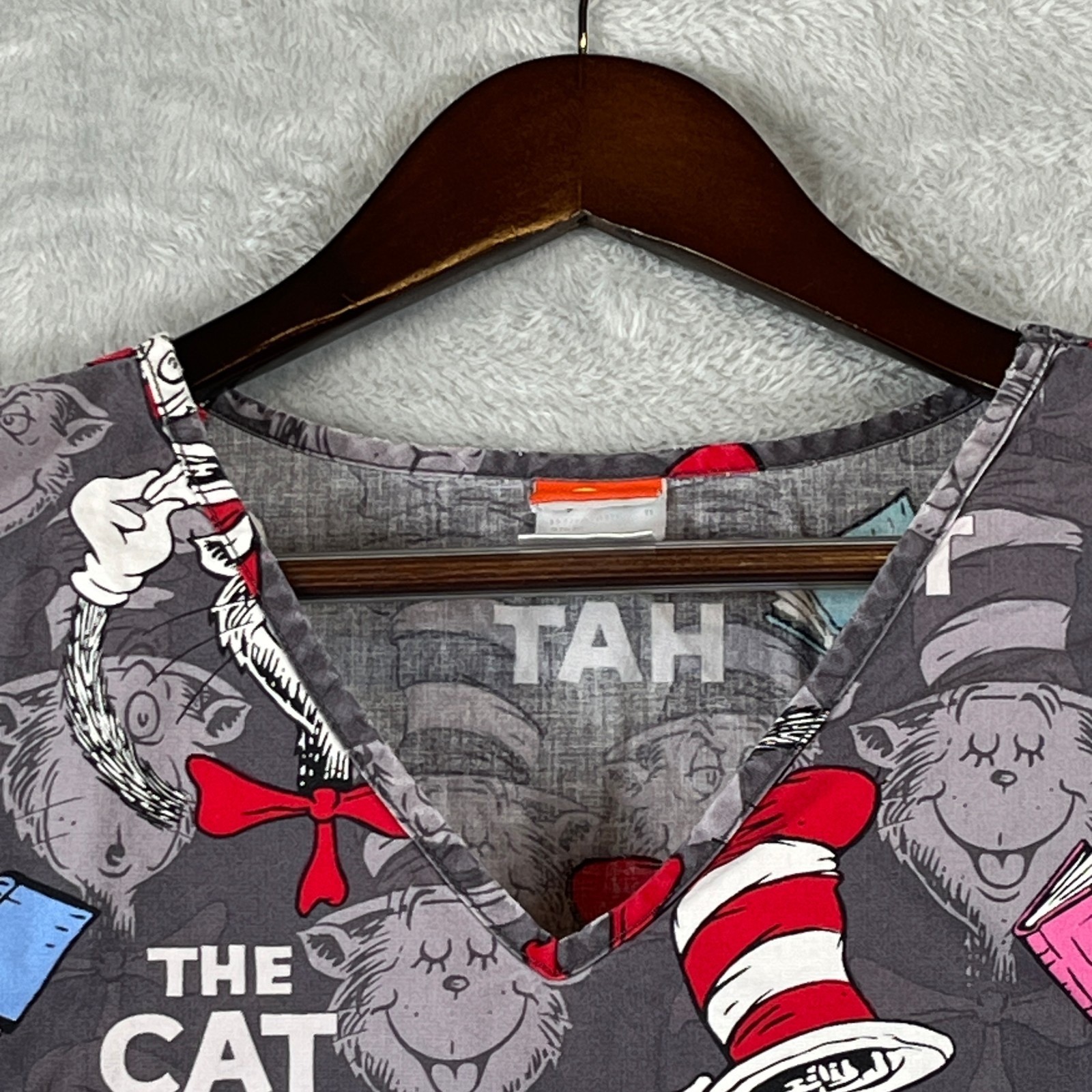 Dr Seuss Scrub Top Womens L Cat in the Hat Gray V Neck Medical Nursing Shirt
