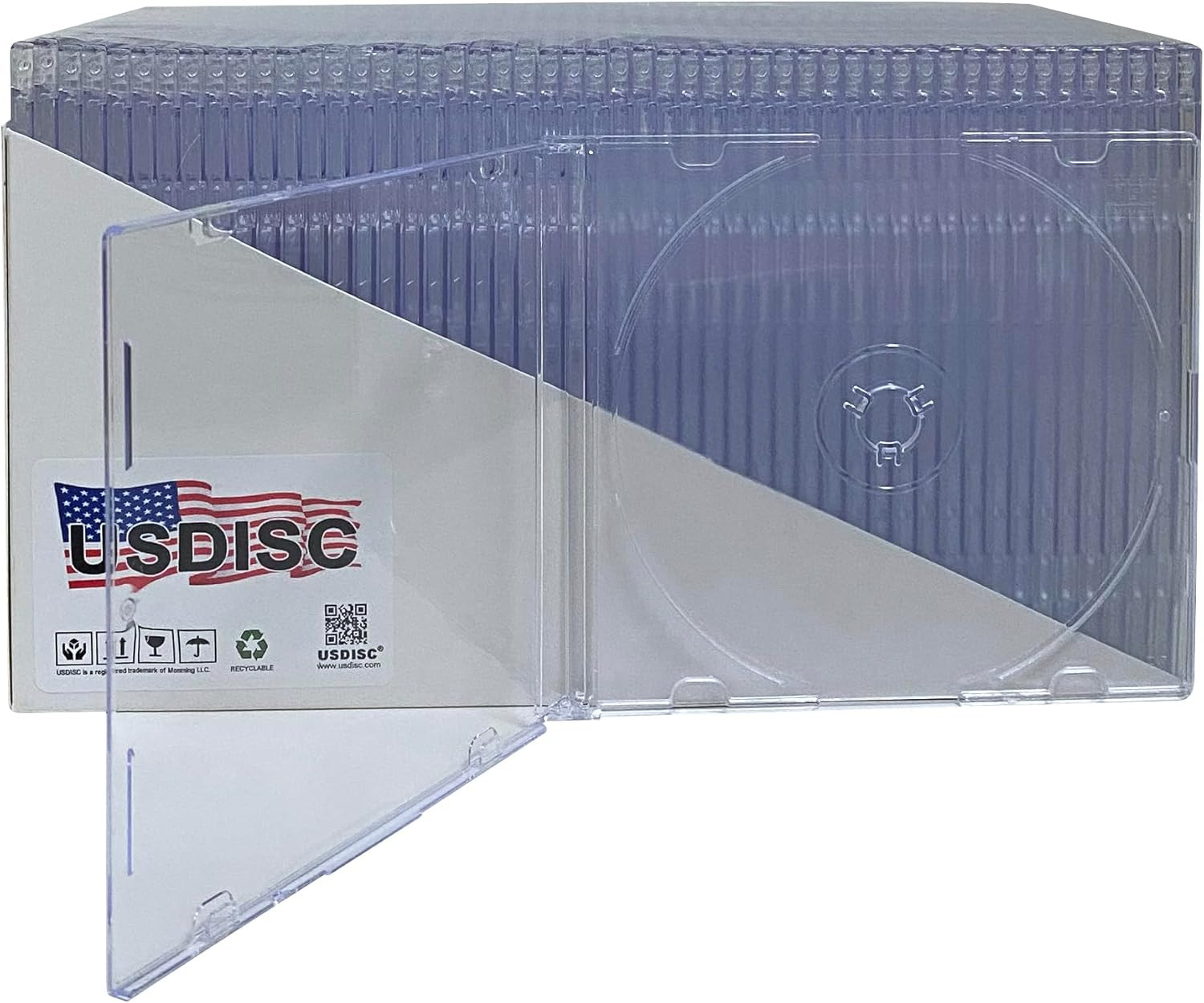 USDISC CD Jewel Cases Slimline 5.2Mm, Single 1 Disc, Clear, Pack of 10