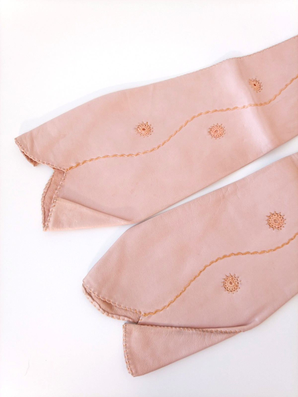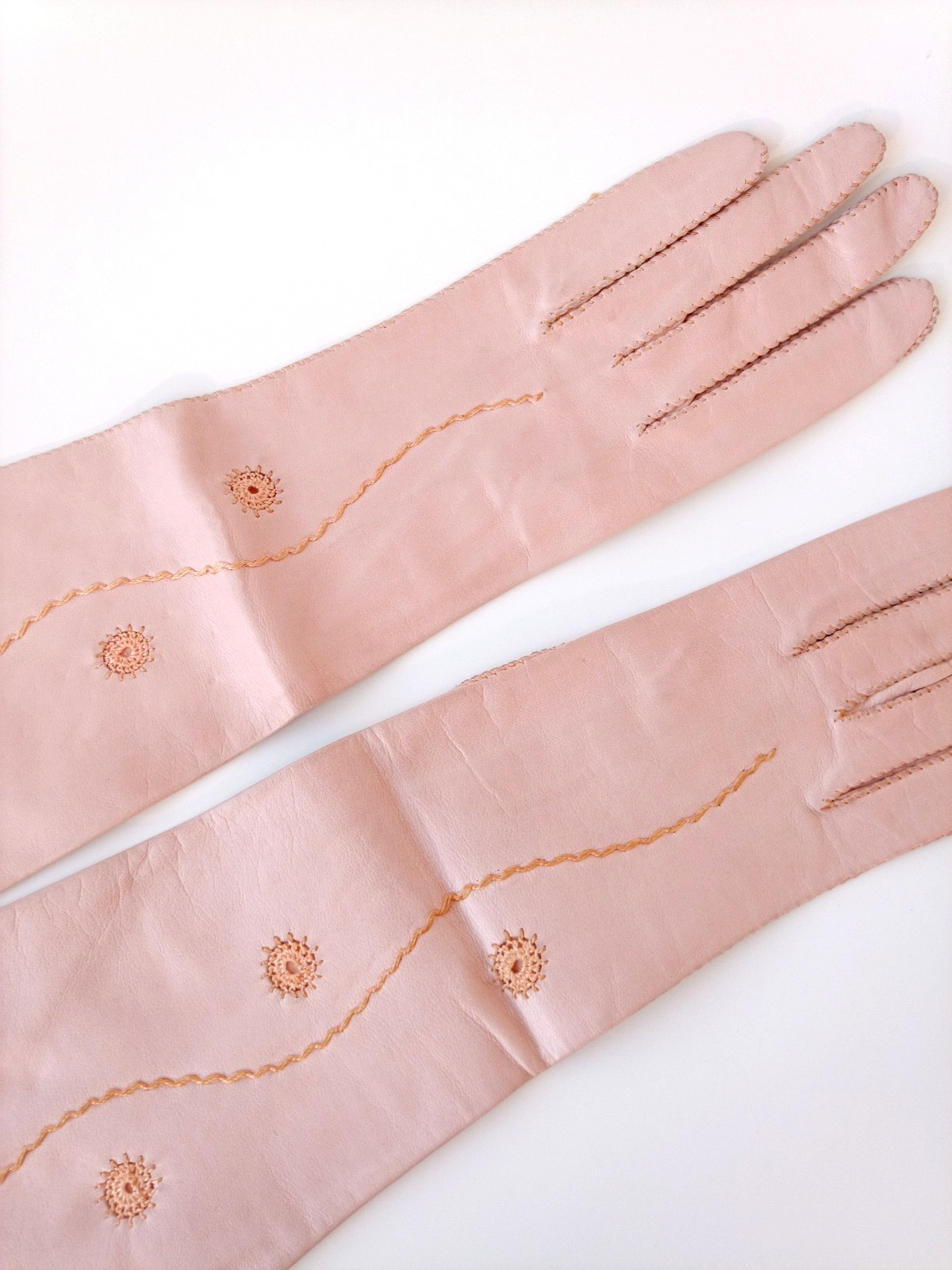 как выглядит Vintage 1950s 1960s Soft Pink Leather Light Weight Gloves Small Embroidered фото