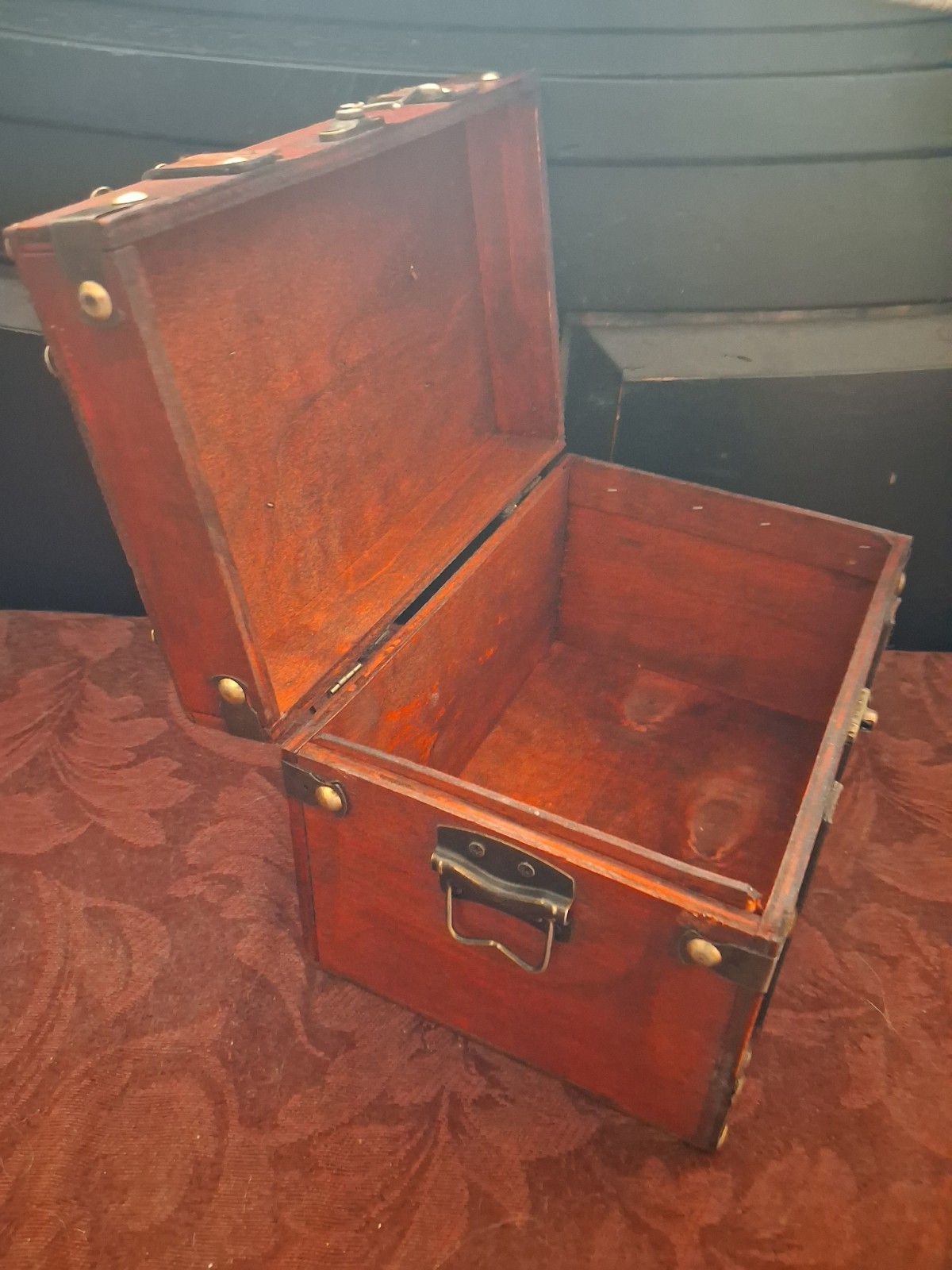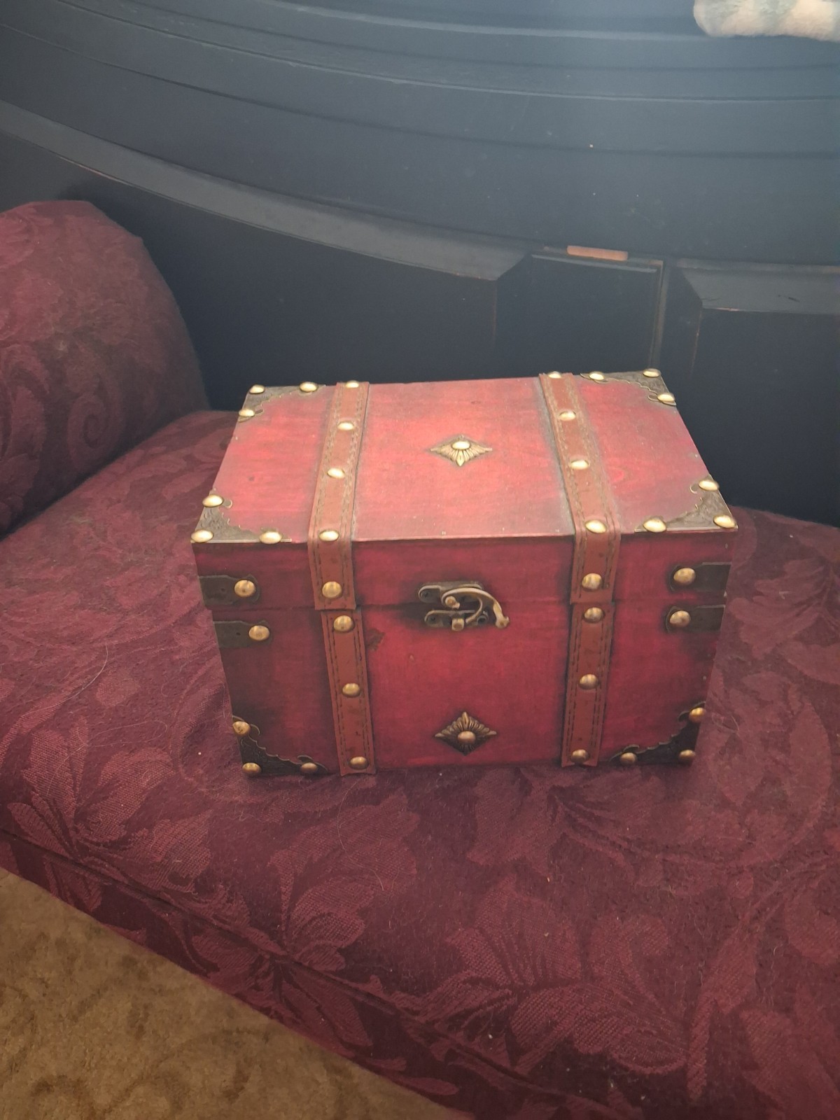 Vintage Retro Wooden Chest w/Metal Accents, Leather Straps, Brown Red, Bedroom