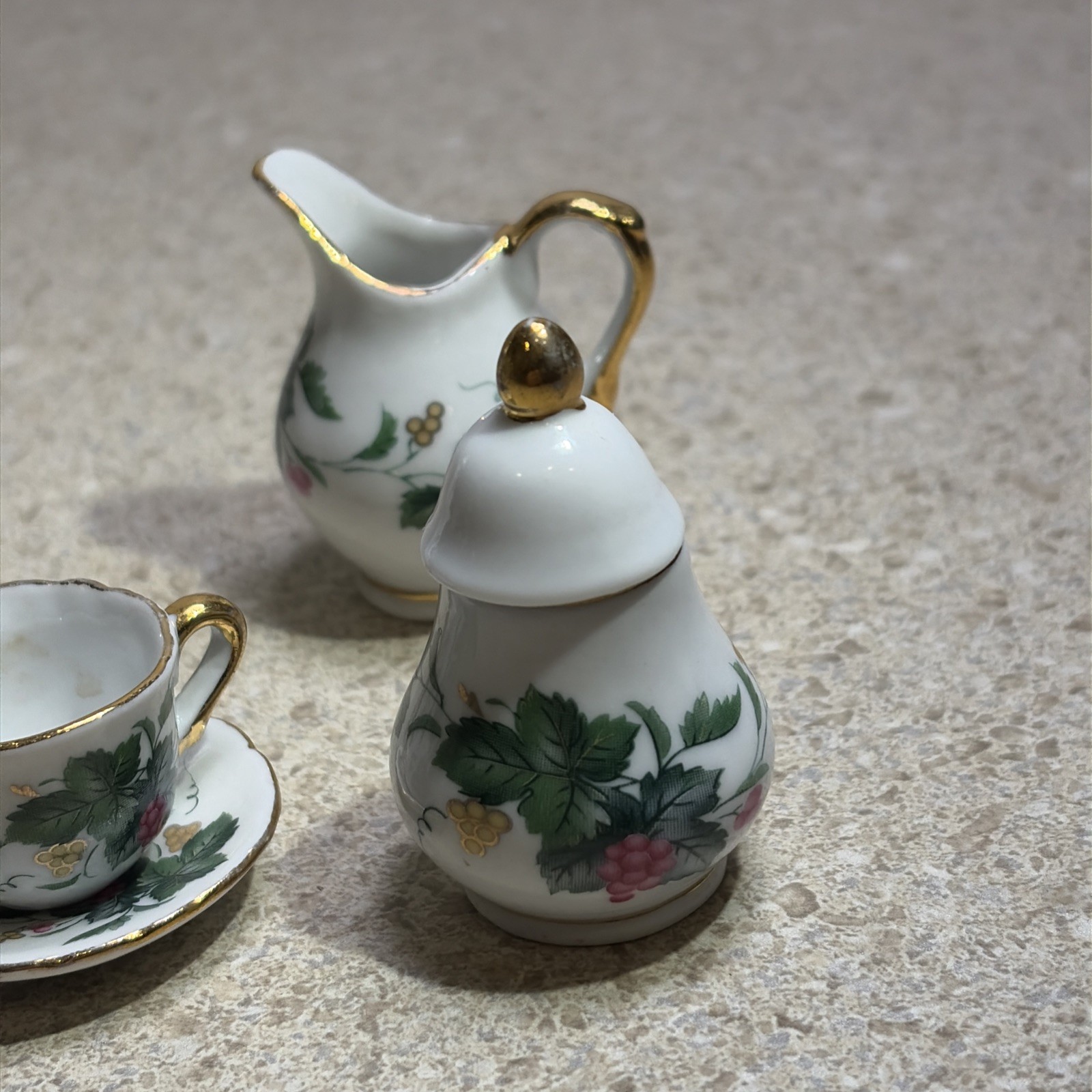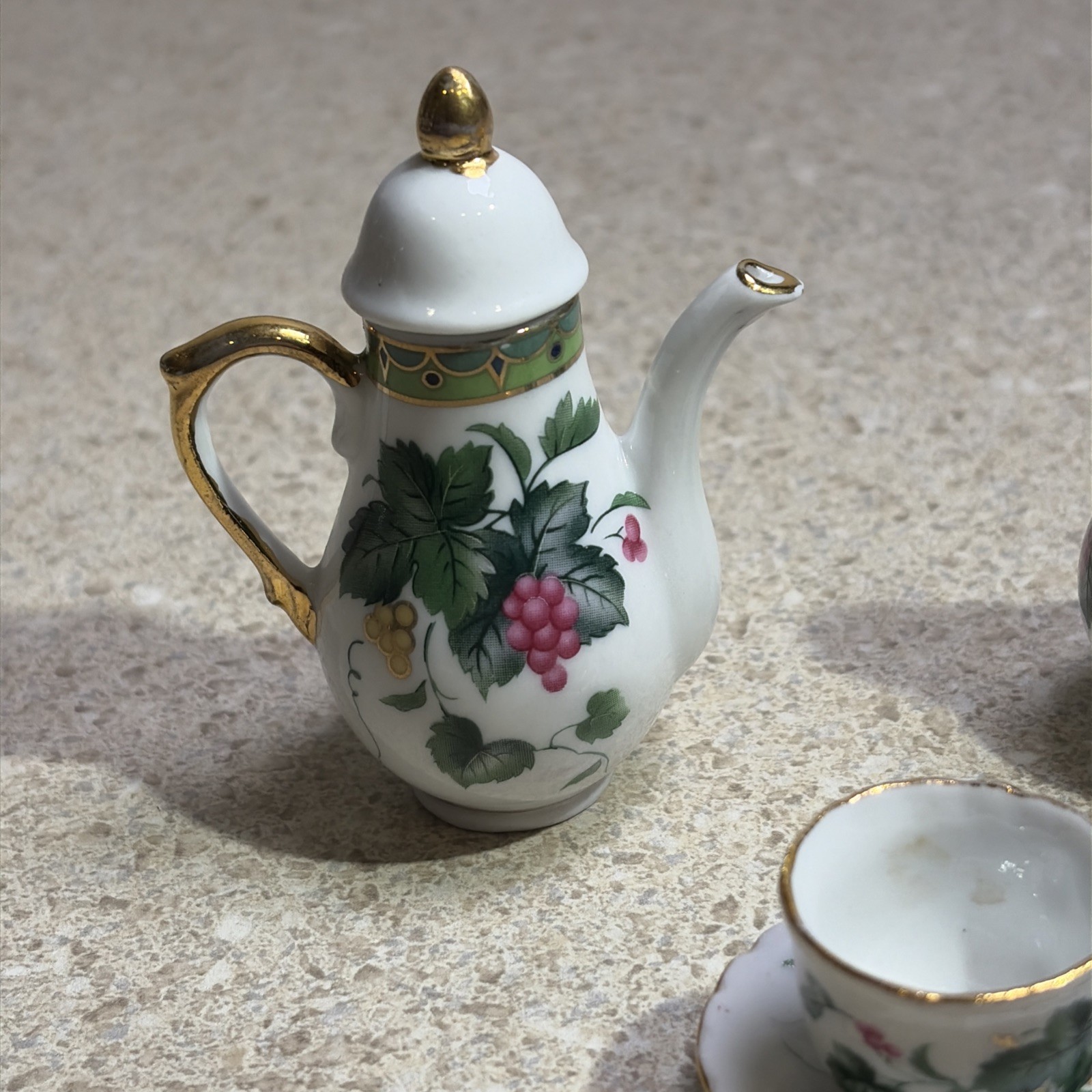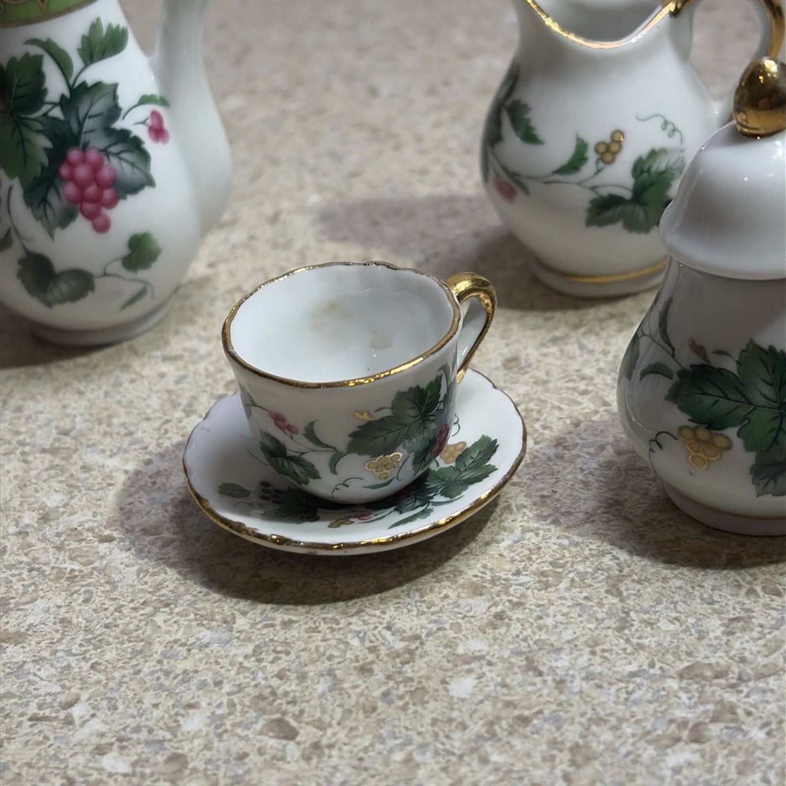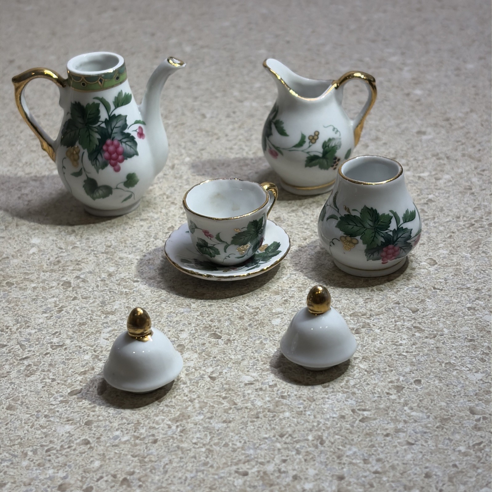 H1094A Vintage Fine Porcelain Mini Tea Set Gold Accent Leaves Berries