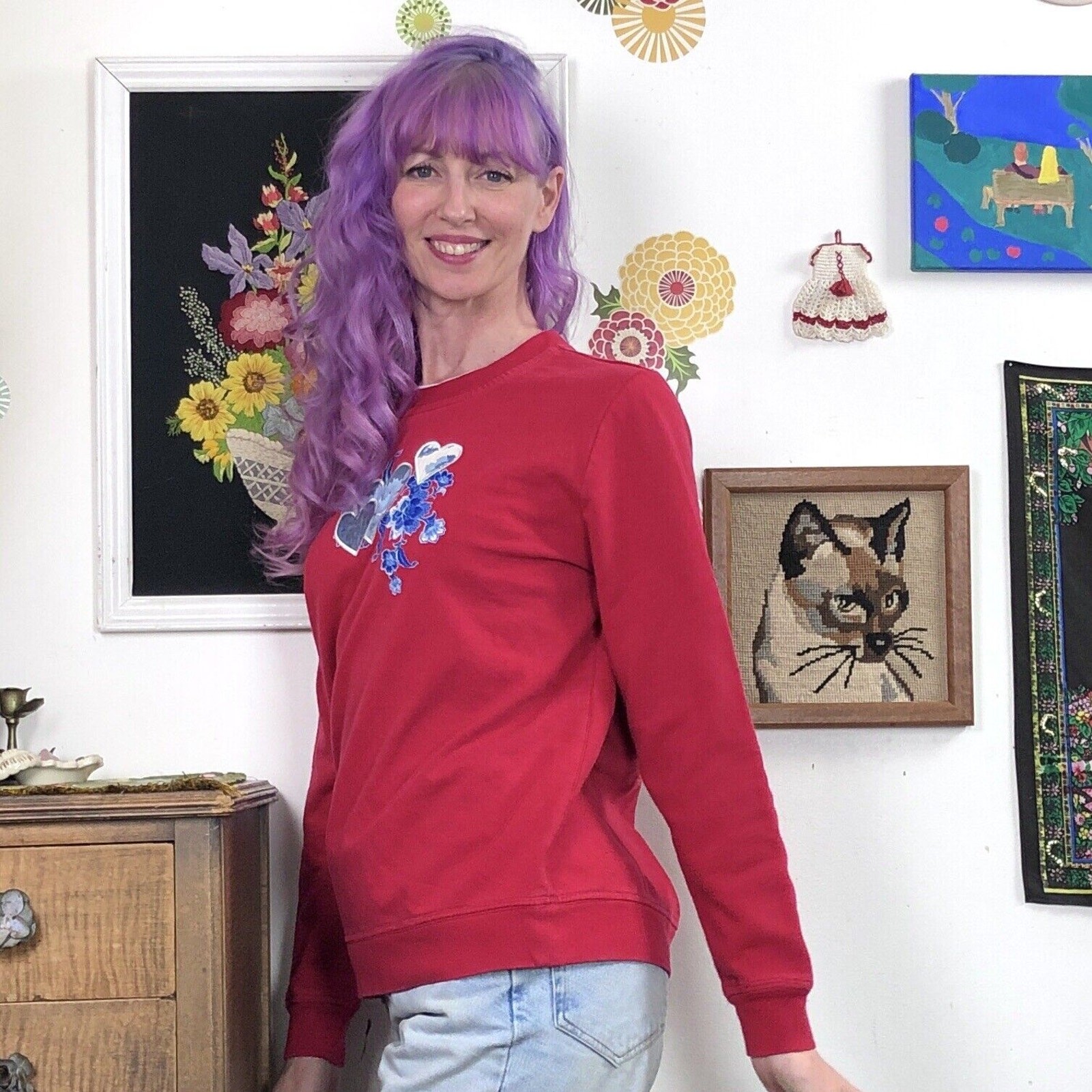 Vintage Grannycore Crew Neck, 90s Red Sweatshirt w/ Blue Flowers Hearts Sz L