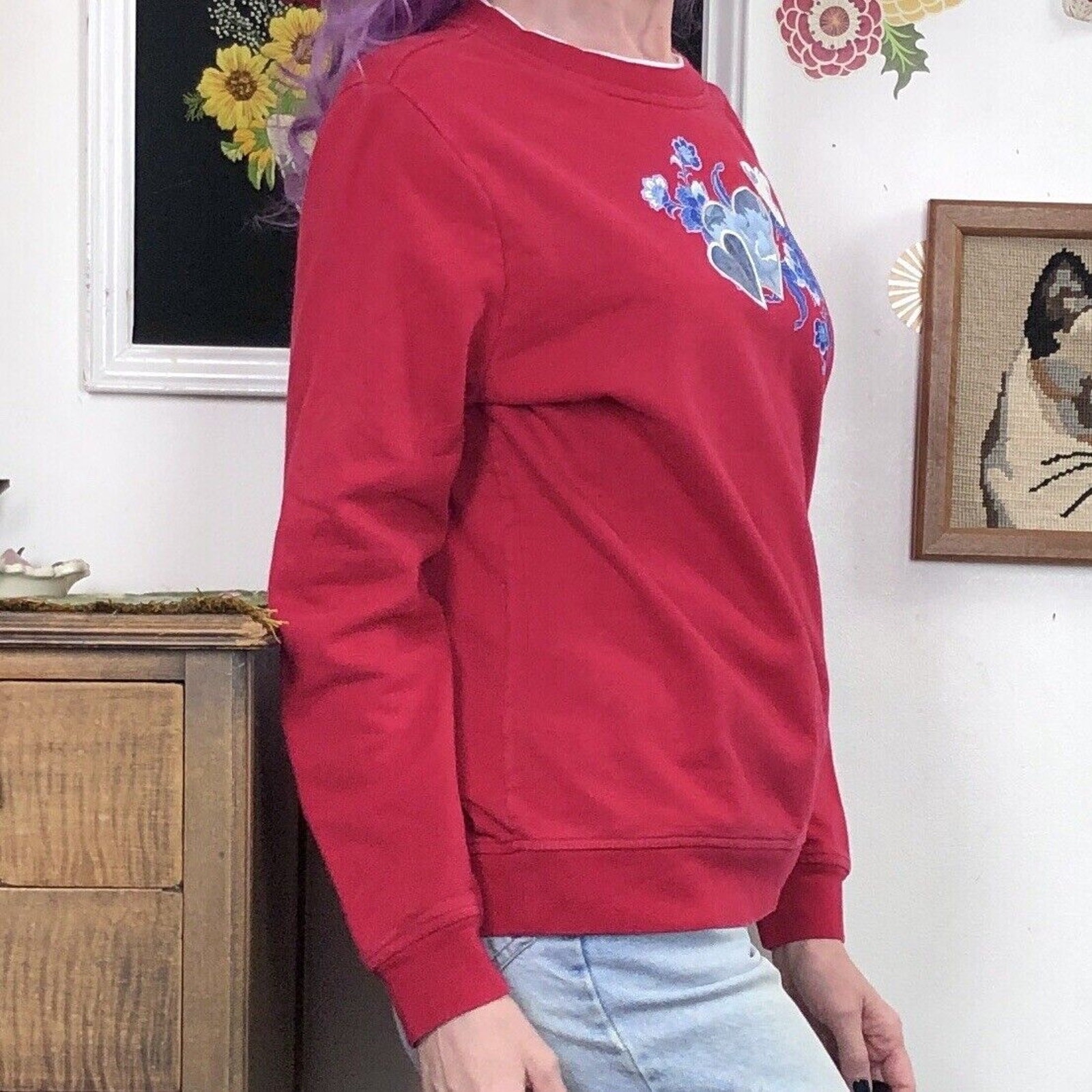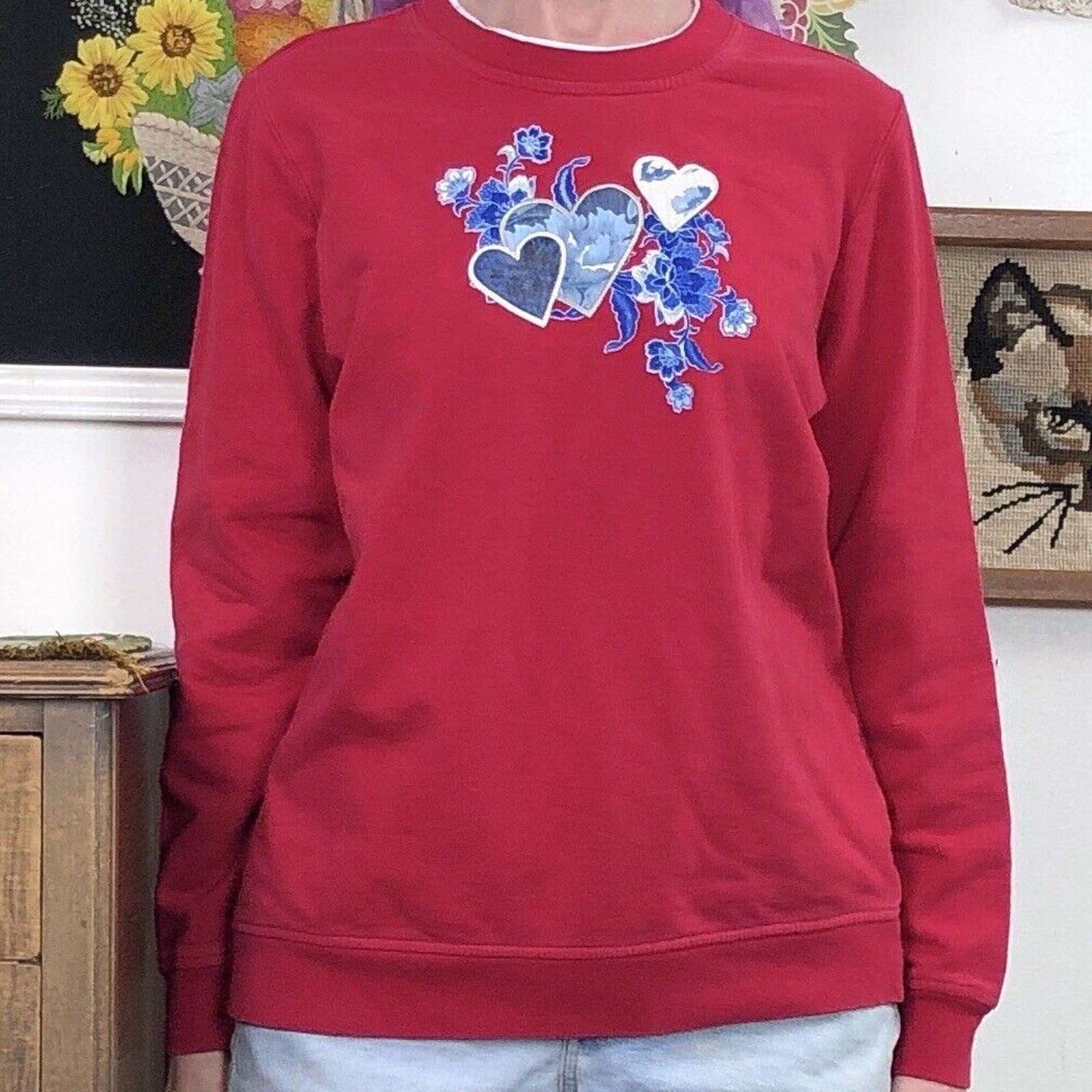 как выглядит Vintage Grannycore Crew Neck, 90s Red Sweatshirt w/ Blue Flowers Hearts Sz L фото