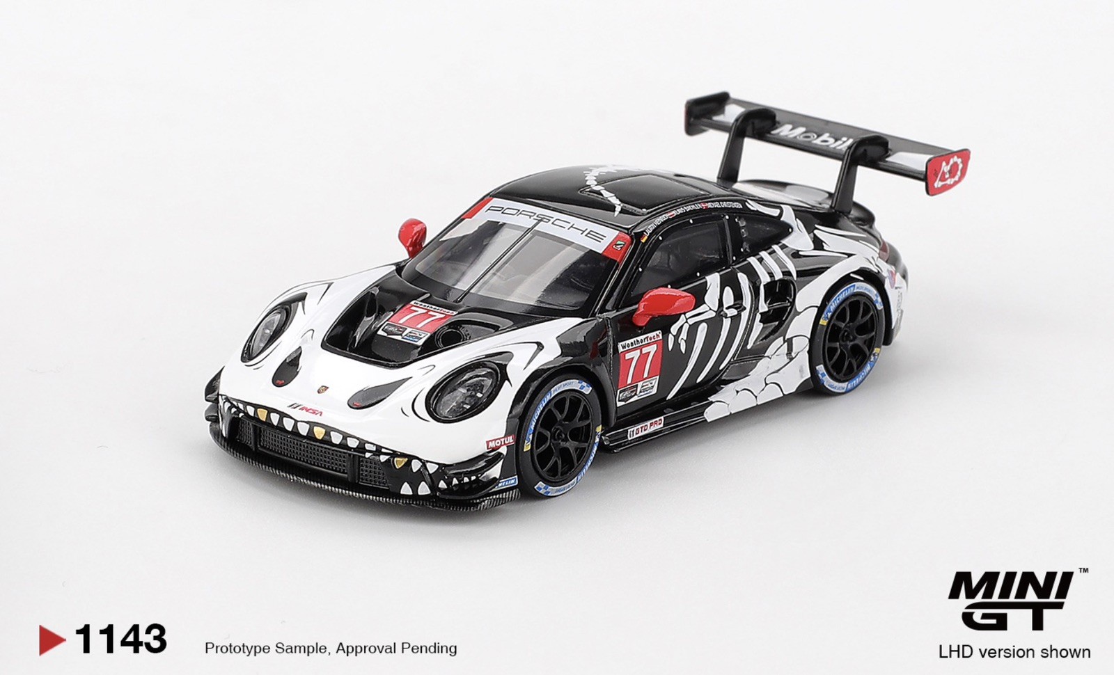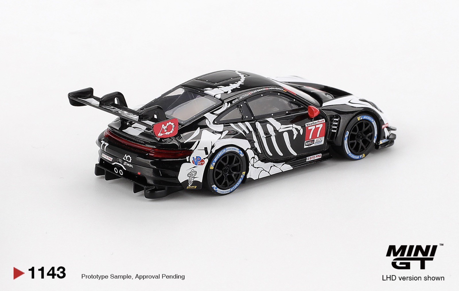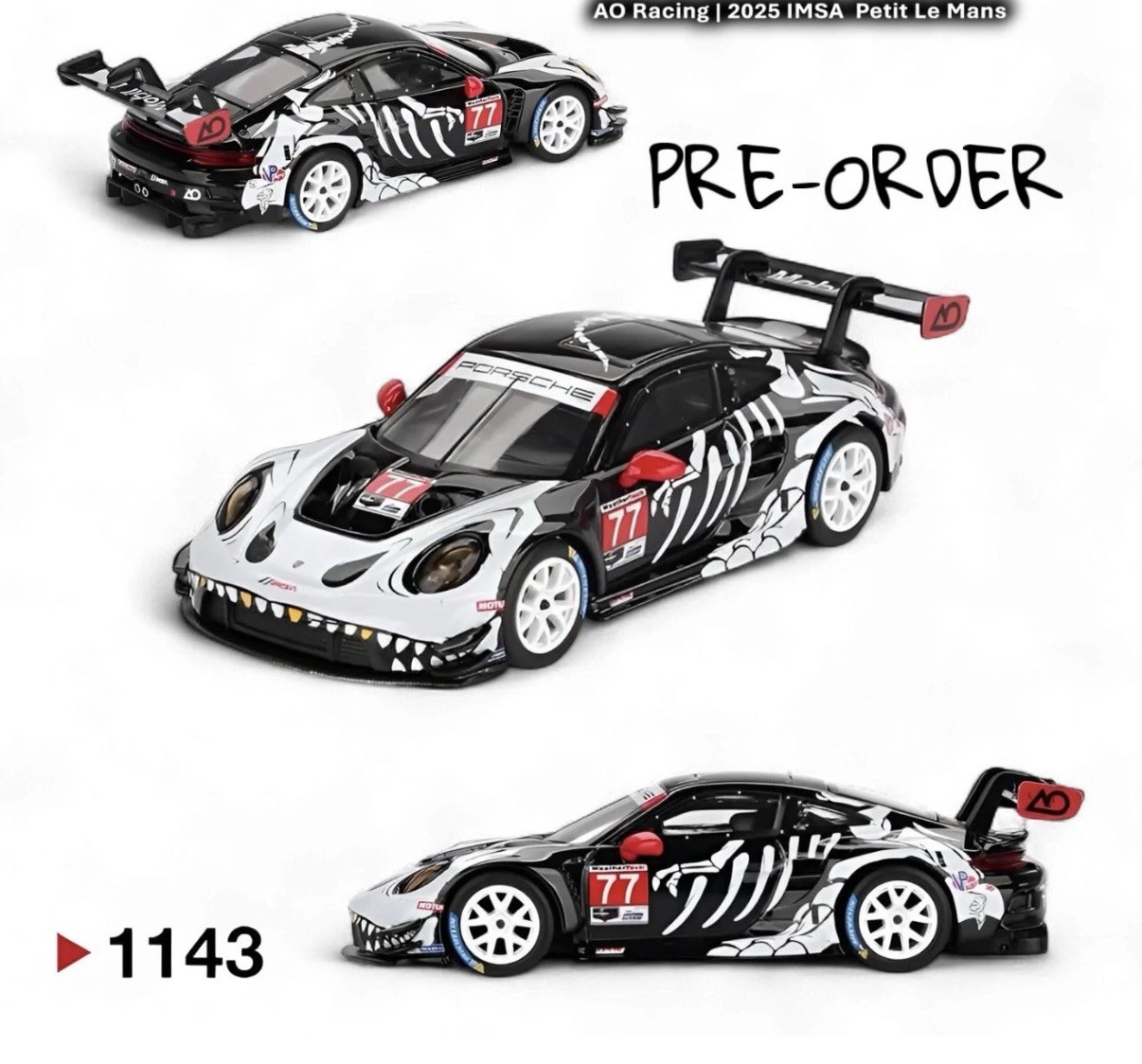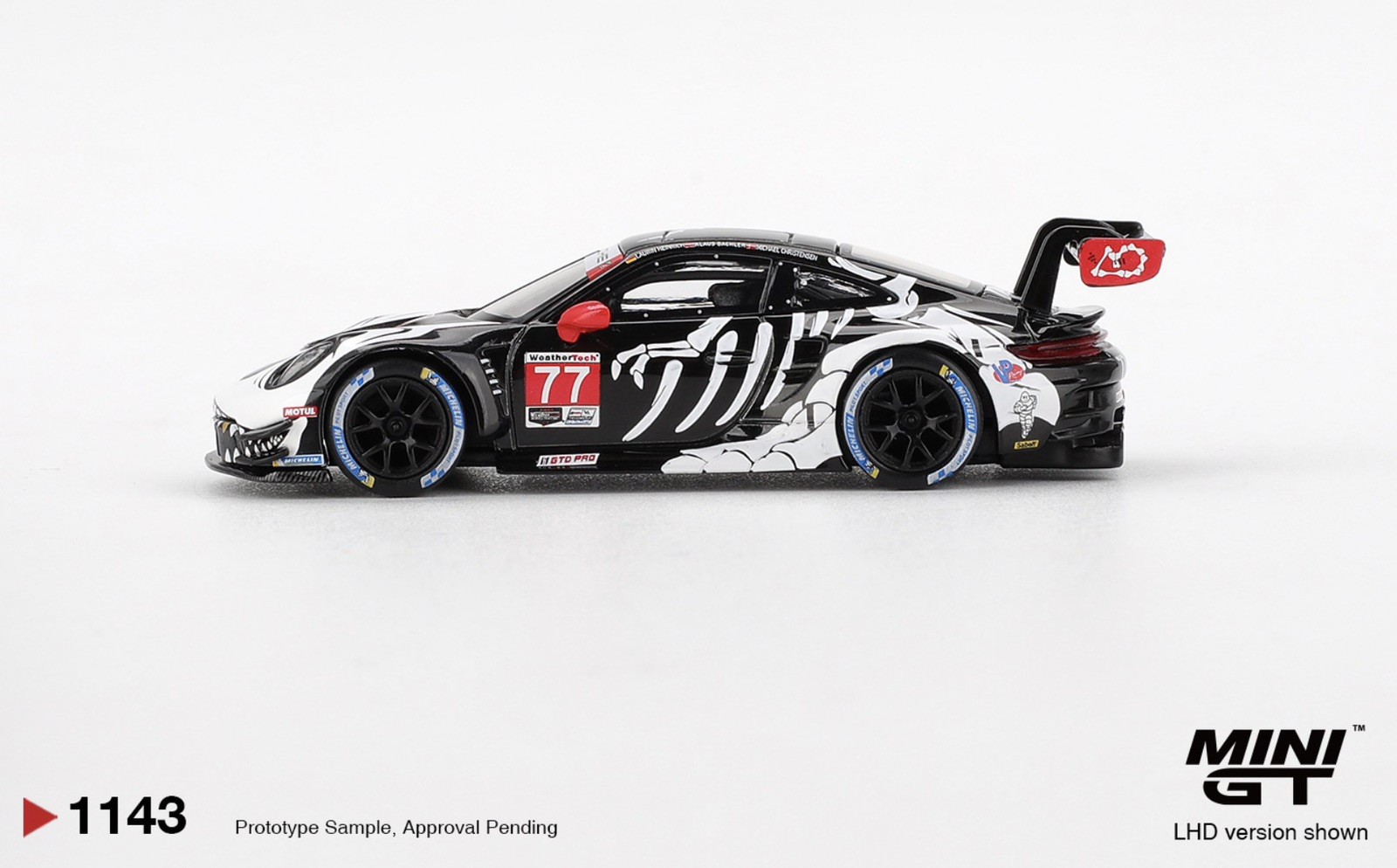 PRE-ORDER MINI GT 1143 Porsche 911 GT3 R 77 AO Racing Skeleton Rexy Roxy