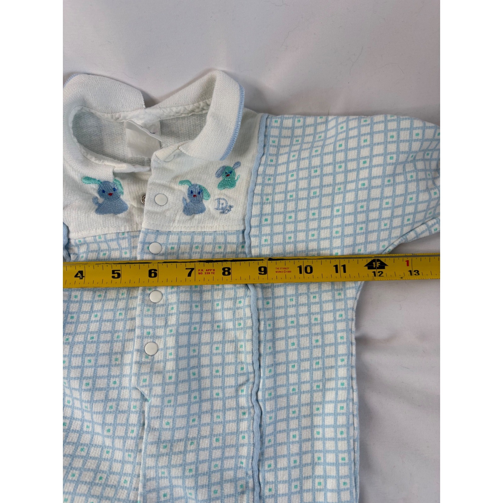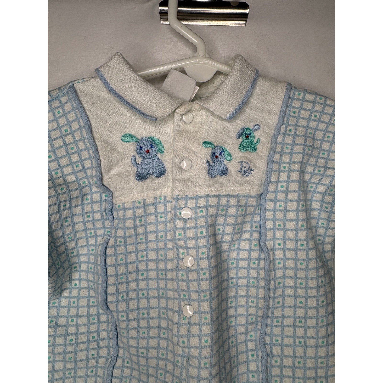 Vintage Baby Dior Blue White Grid Puppy Dog Embroidered Romper One pc Pajamas