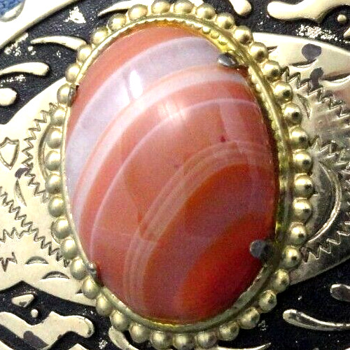 как выглядит Western Floral Scroll Dress Belt Buckle Pink Orange Banded Agate Vtg 80s .TYC720 фото