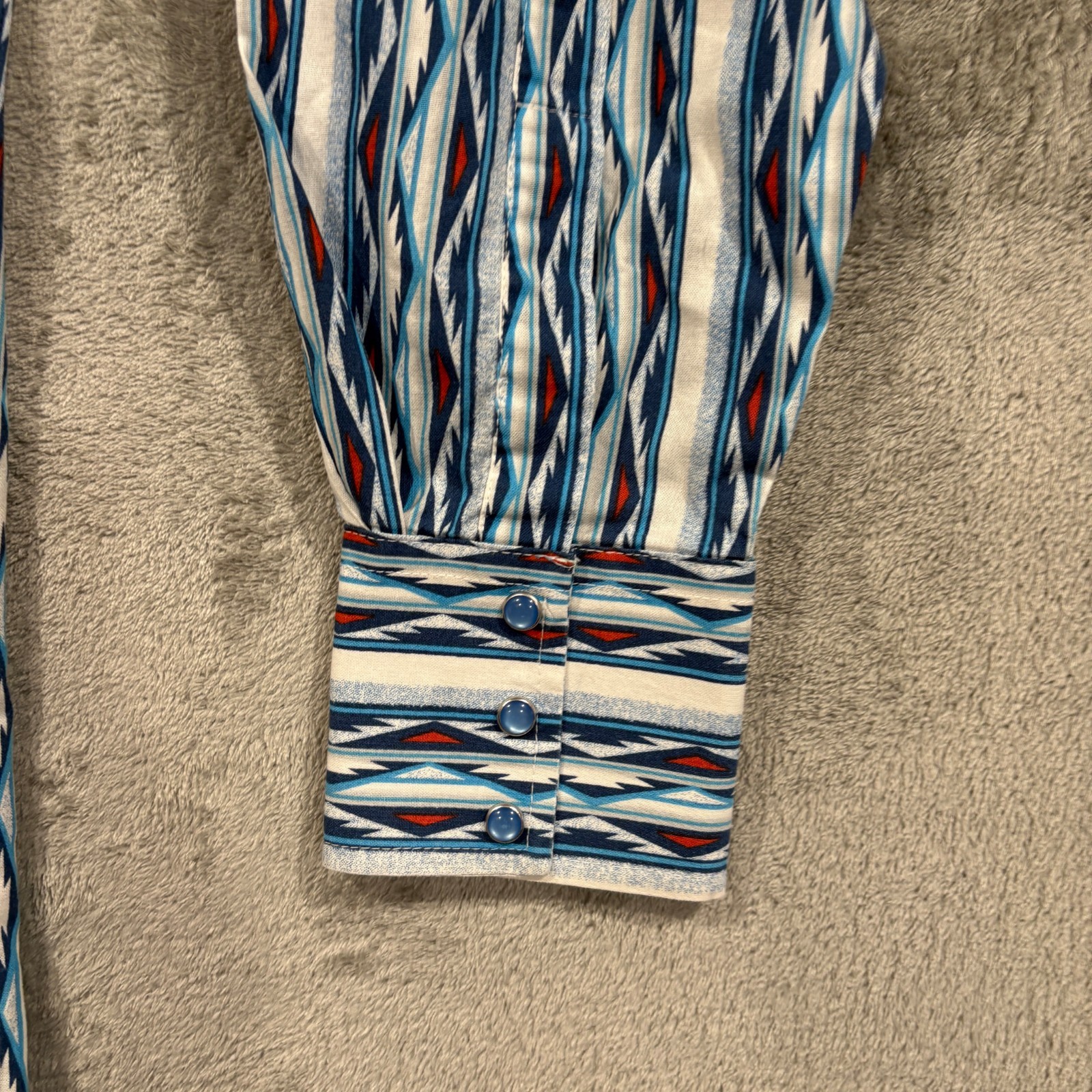 Vintage 90s Wrangler Western Shirt Men Medium Pearl Snap Aztec Southwestern Blue