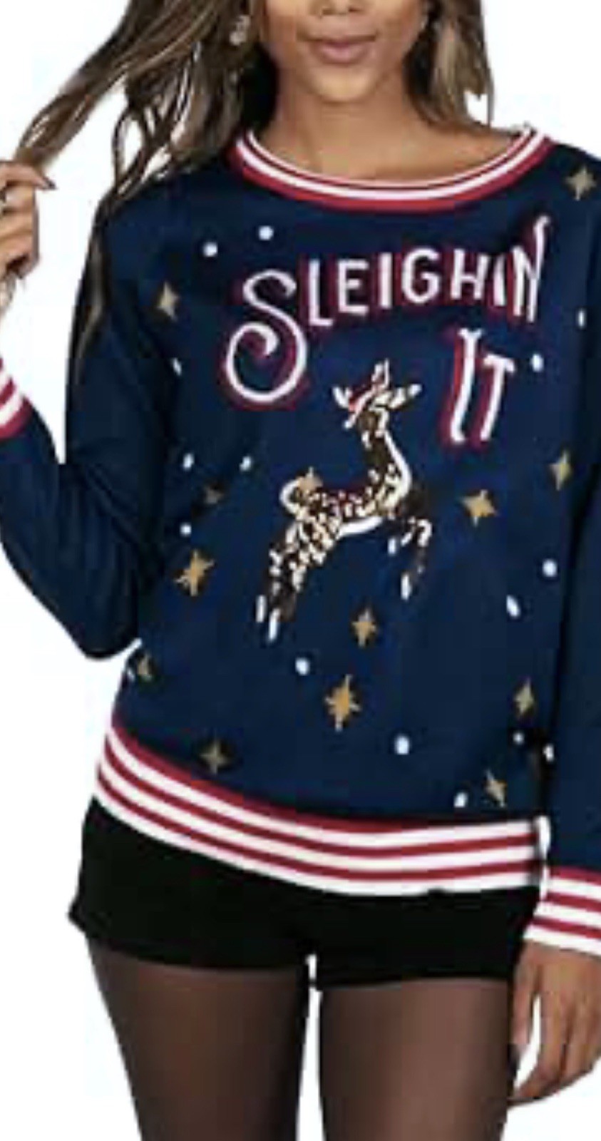 Tipsy Elves Sleighin' It Ugly Christmas Sweater Sequin Reindeer Navy Women's M