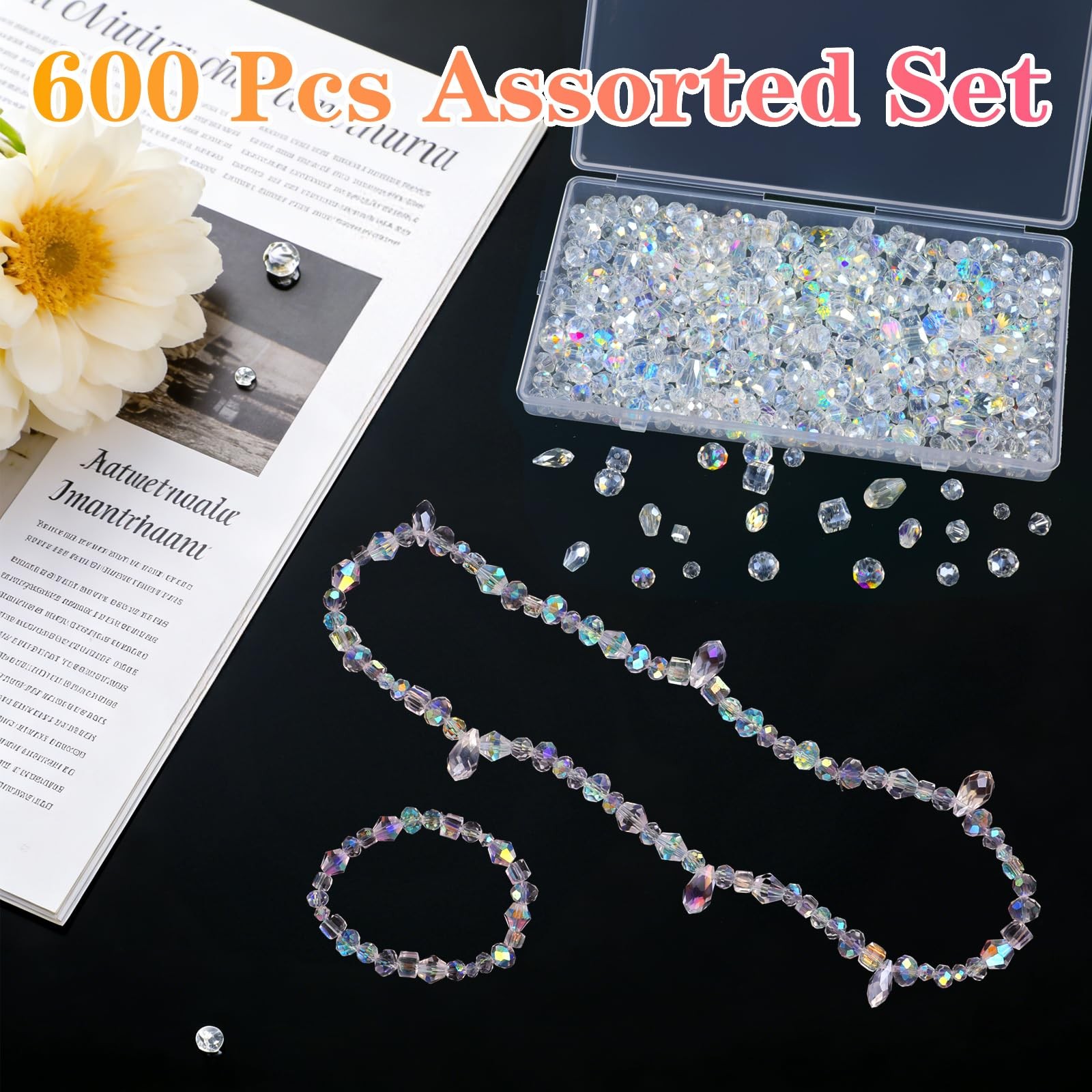 600 Pcs Crystal Glass Beads for Jewelry Making, Crystal Beads with Box, Assorted