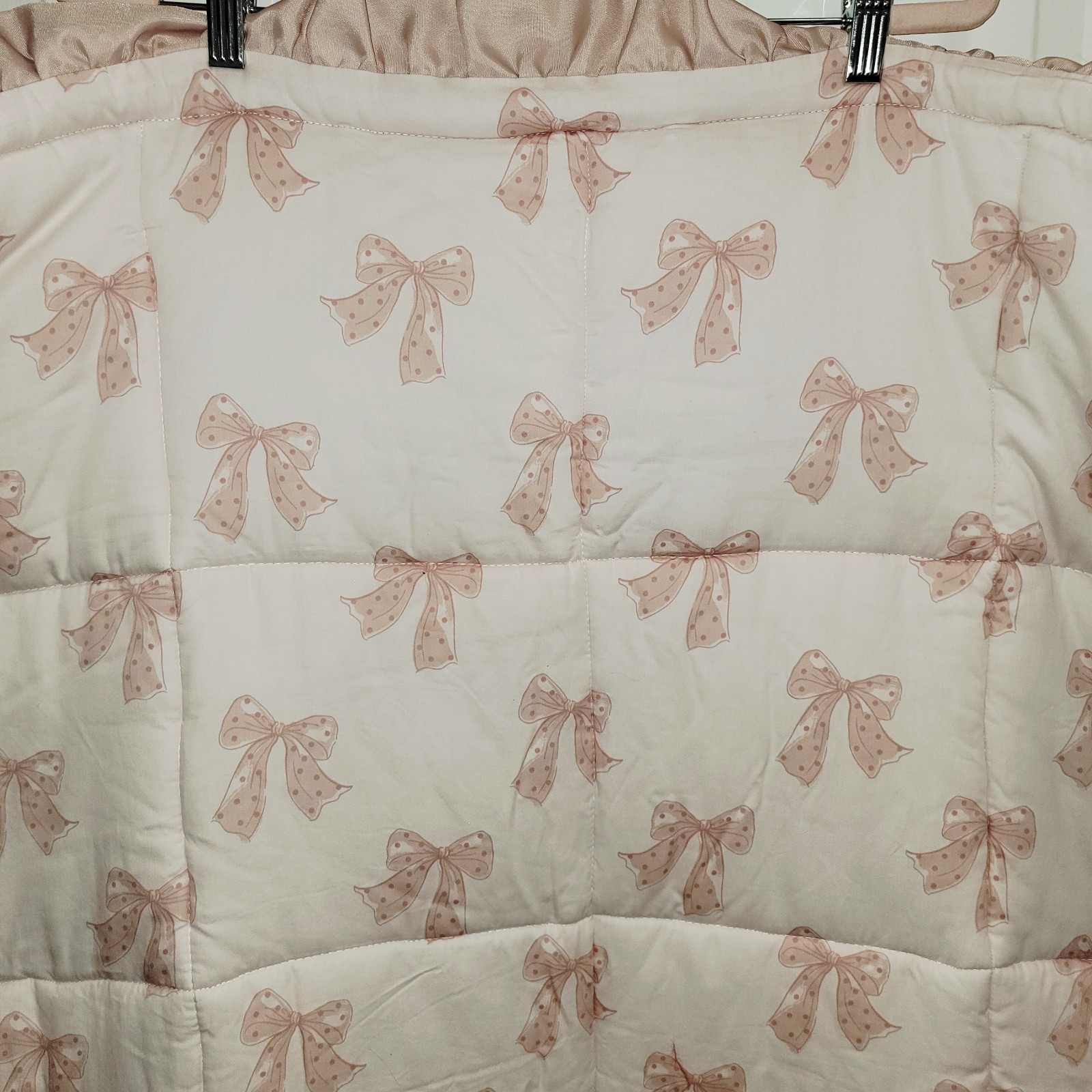 как выглядит The Peanutshell Baby Quilt Pink White Gold Patchwork Bows Ruffle Trim 39x45 фото