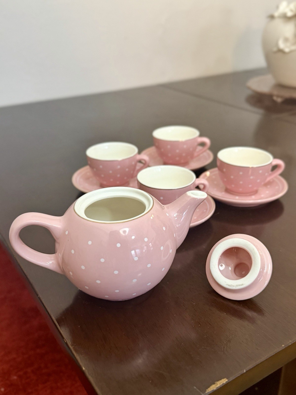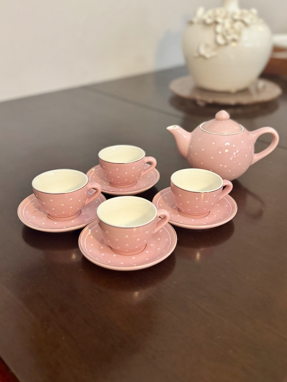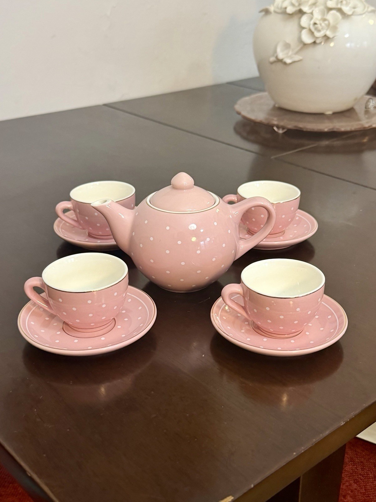 Pink FAO Schwartz Child Ceramic Tea Set Teapot 4 Cups Saucers Polka Dots