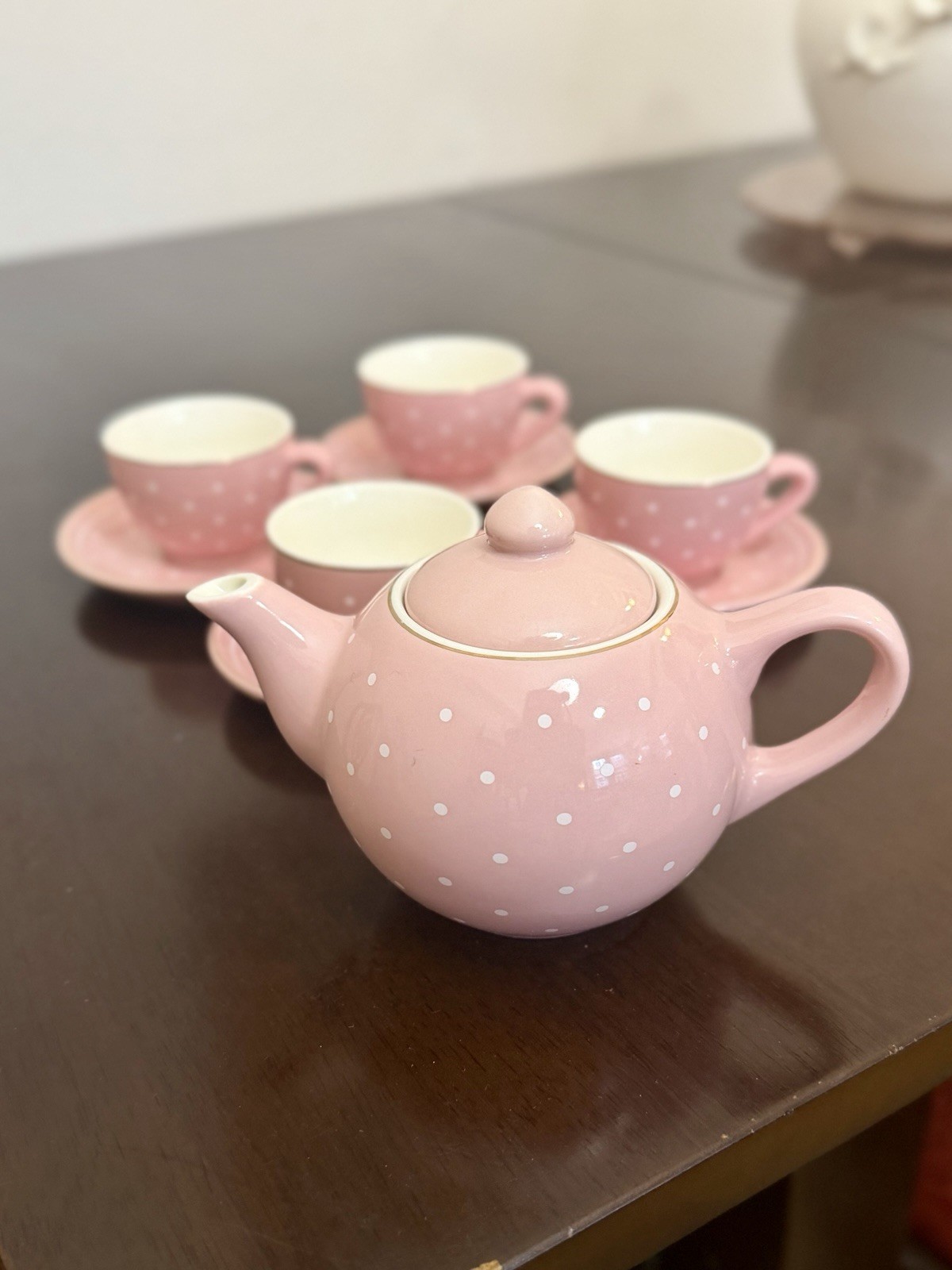 как выглядит Pink FAO Schwartz Child Ceramic Tea Set Teapot 4 Cups Saucers Polka Dots фото