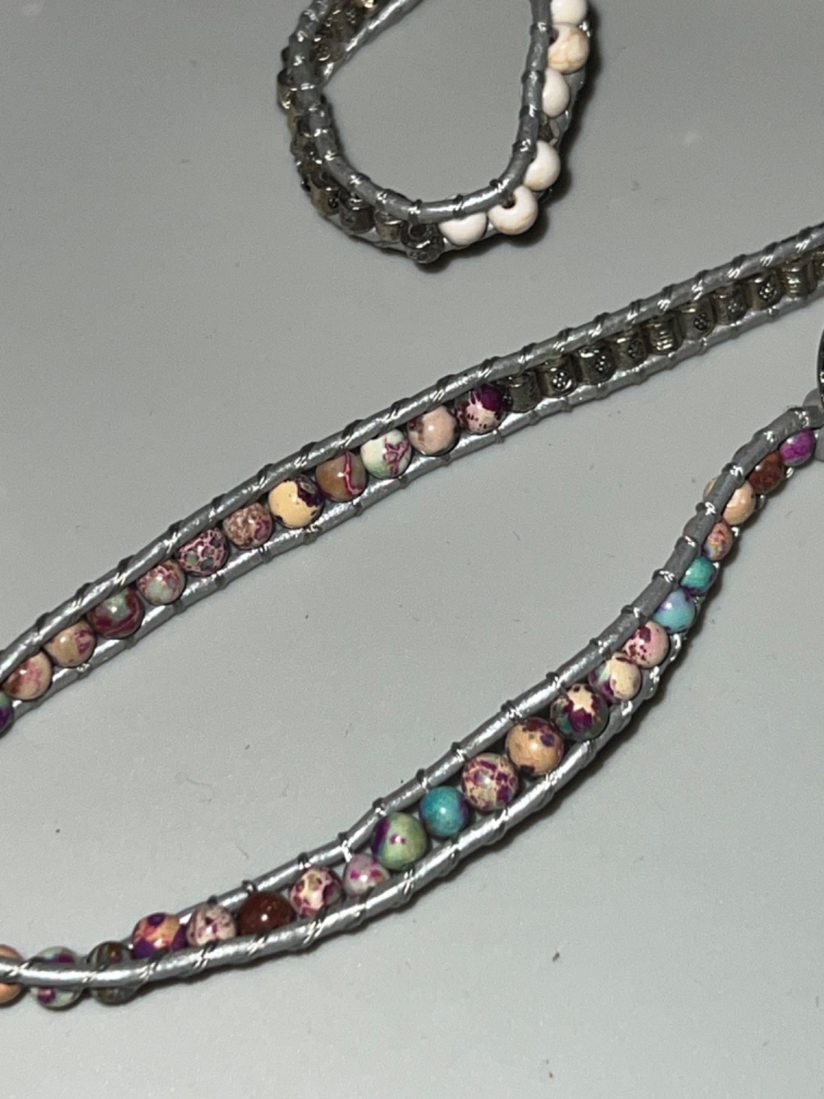 как выглядит Handcrafted Gray Leather Wrap Bracelet w/ Turquiose Stone Multicolored Beads фото