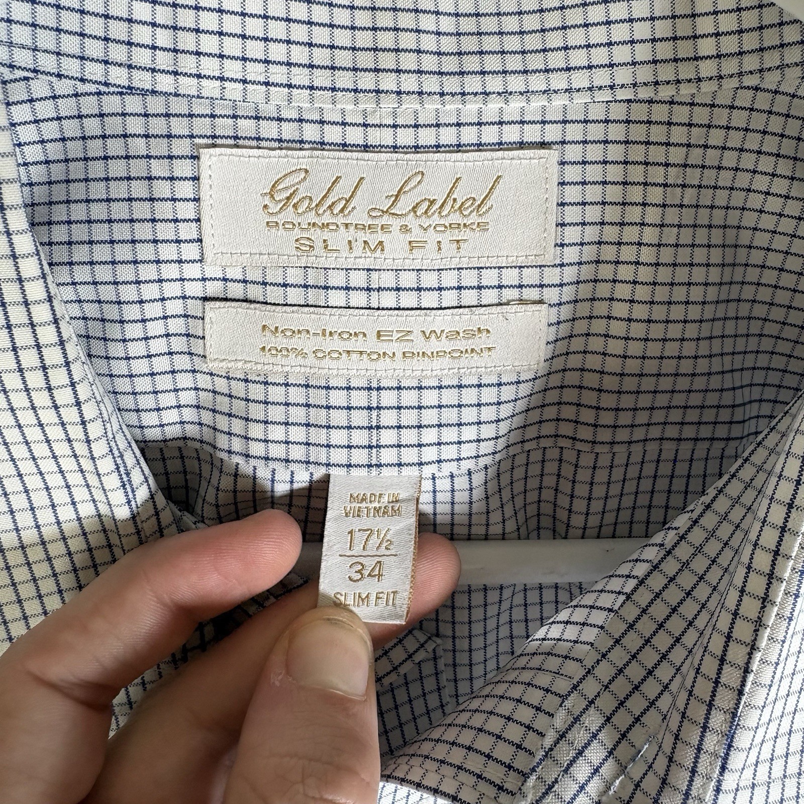 Roundtree Yorke Gold Label Dress Shirt Mens 17.5 34 XL Grid Non Iron Pinpoint