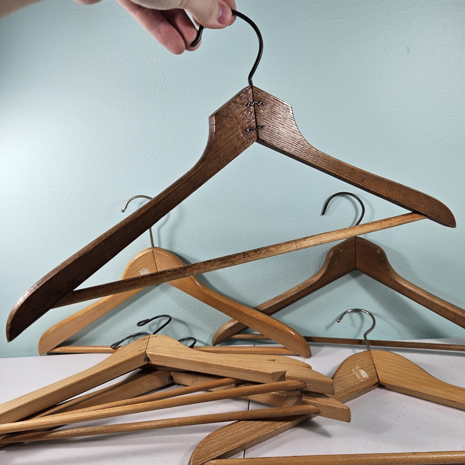 Lot of 10 Vintage Wood Suit Hangers, Advertising, 17