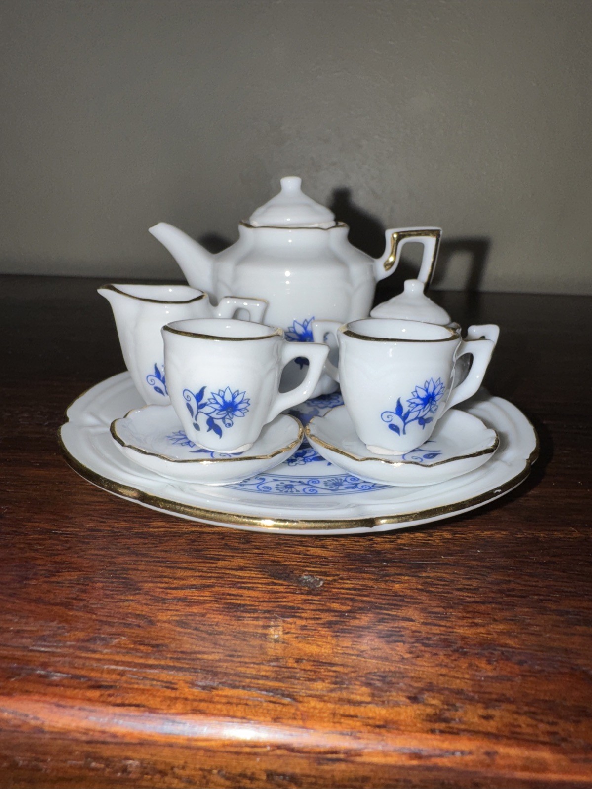 Vintage Dollhouse Miniature Porcelain China Blue White Flower Tea Set 10 Piece