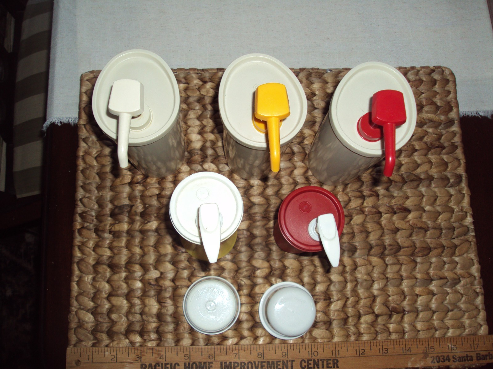 • Vintage Tupperware Pump Dispensers Condiment Ketchup Mayo Mustard Set Lot 5 EUC