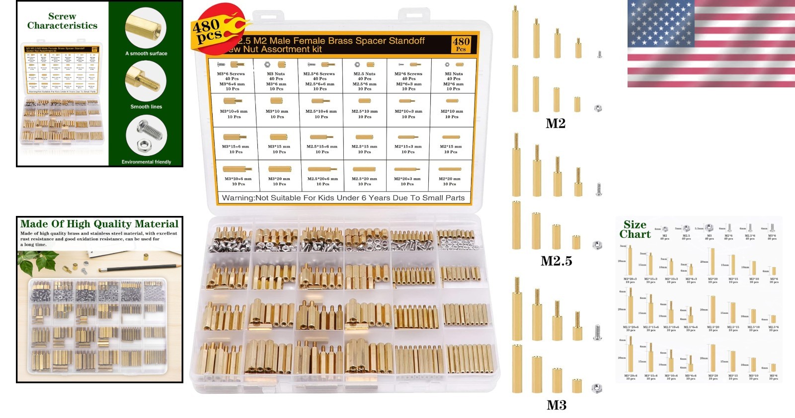 Особенности: Easy to use, Good assortment, Multipurpose, Assorted brass standoffs, Quality threads, Durable, Simple installation