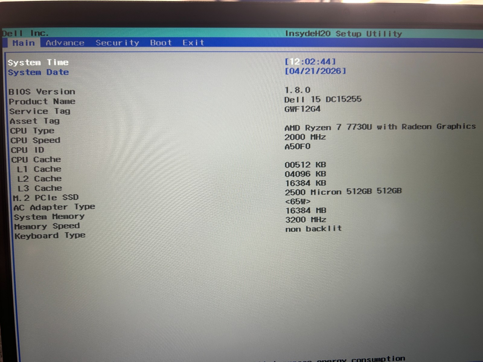 DELL 15 DC15255 G8MK9,, AMD Ryzen 7 7730U, 2.00 GHz, 16 GB RAM, 512 GB NVMe