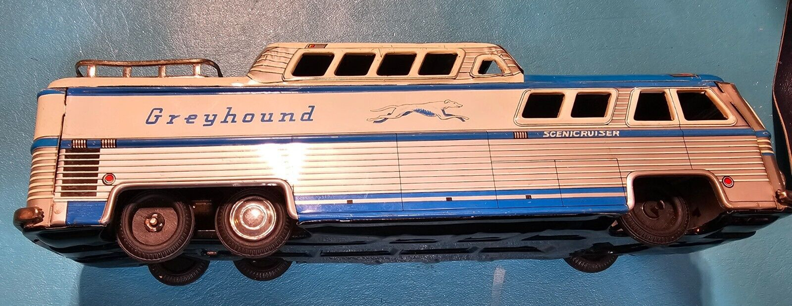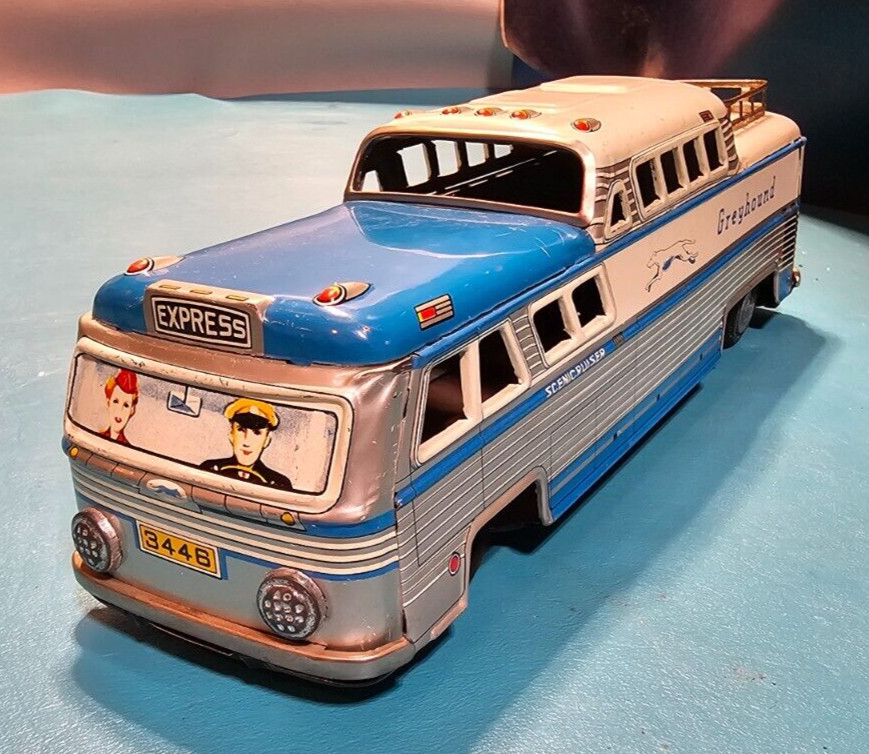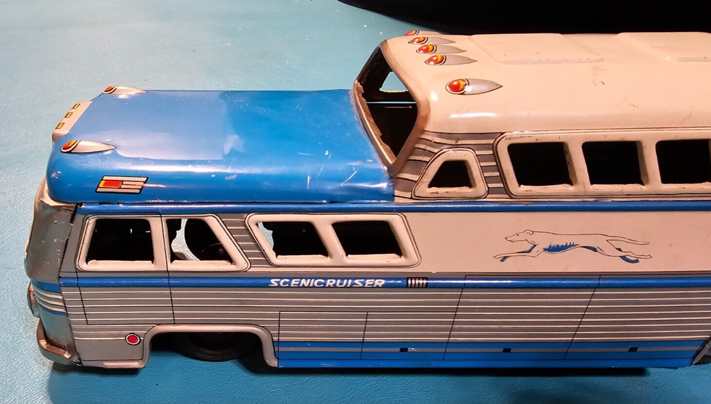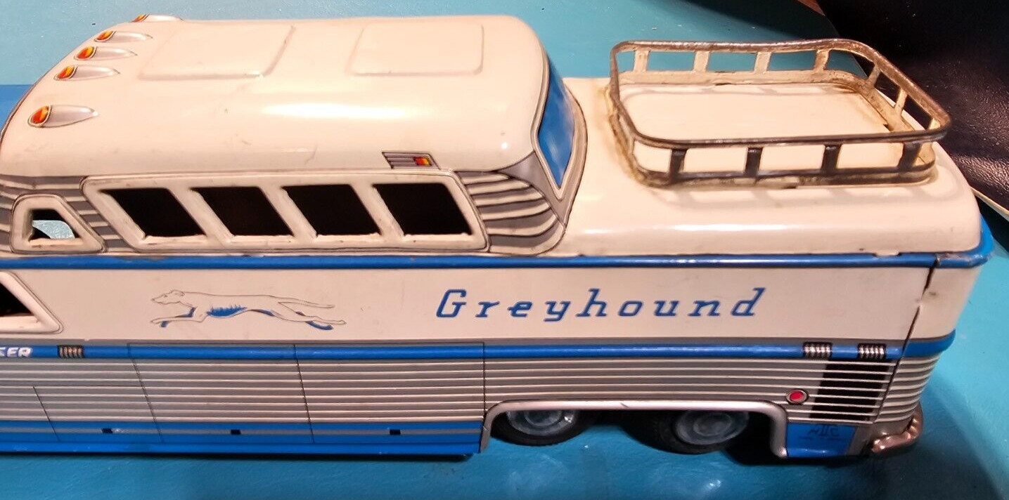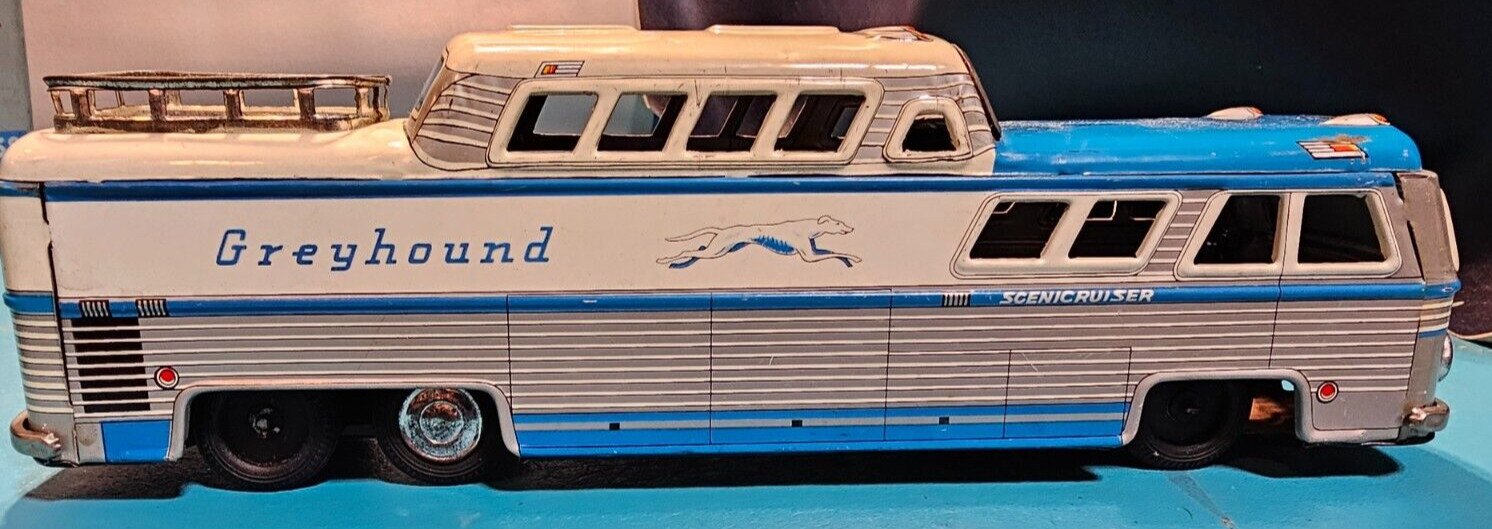VINTAGE TIN GREYHOUND BUS - FRICTION -3446 W/ LUGGAGE RACK - SCENICRUISER -JAPAN