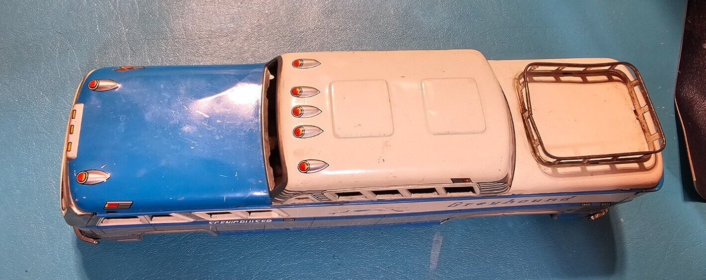 как выглядит VINTAGE TIN GREYHOUND BUS - FRICTION -3446 W/ LUGGAGE RACK - SCENICRUISER -JAPAN фото