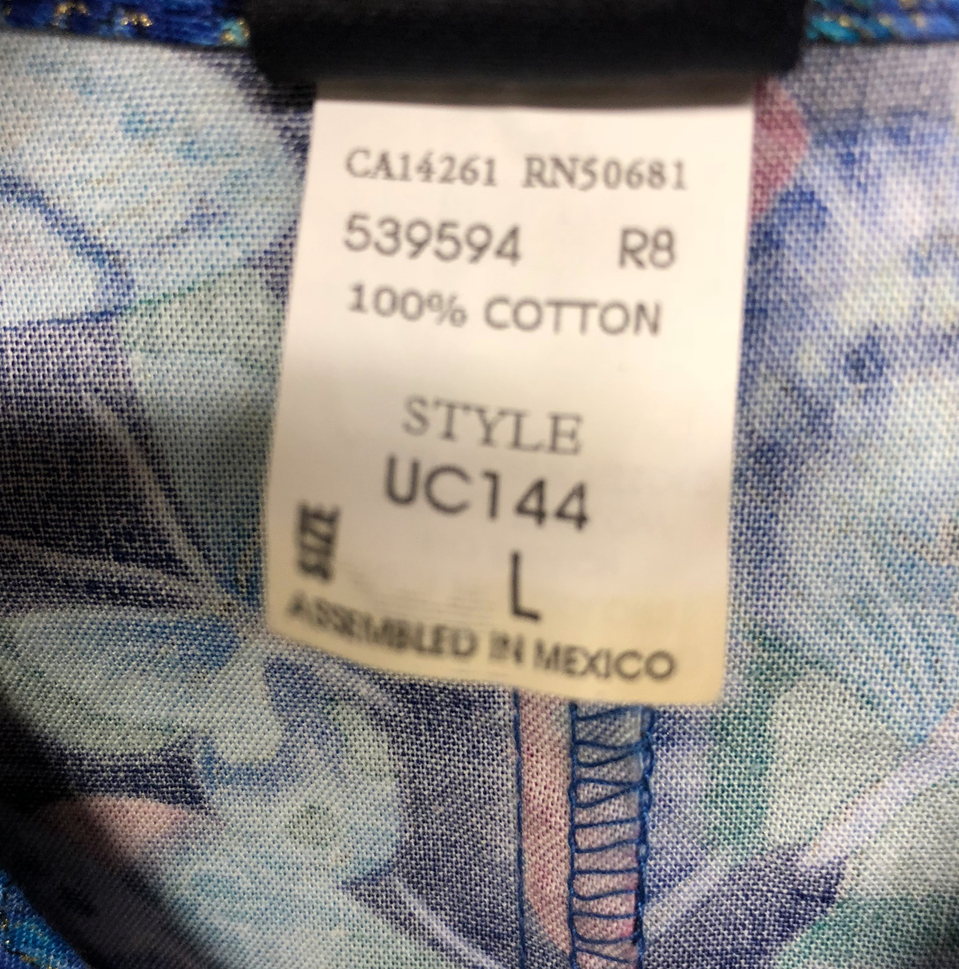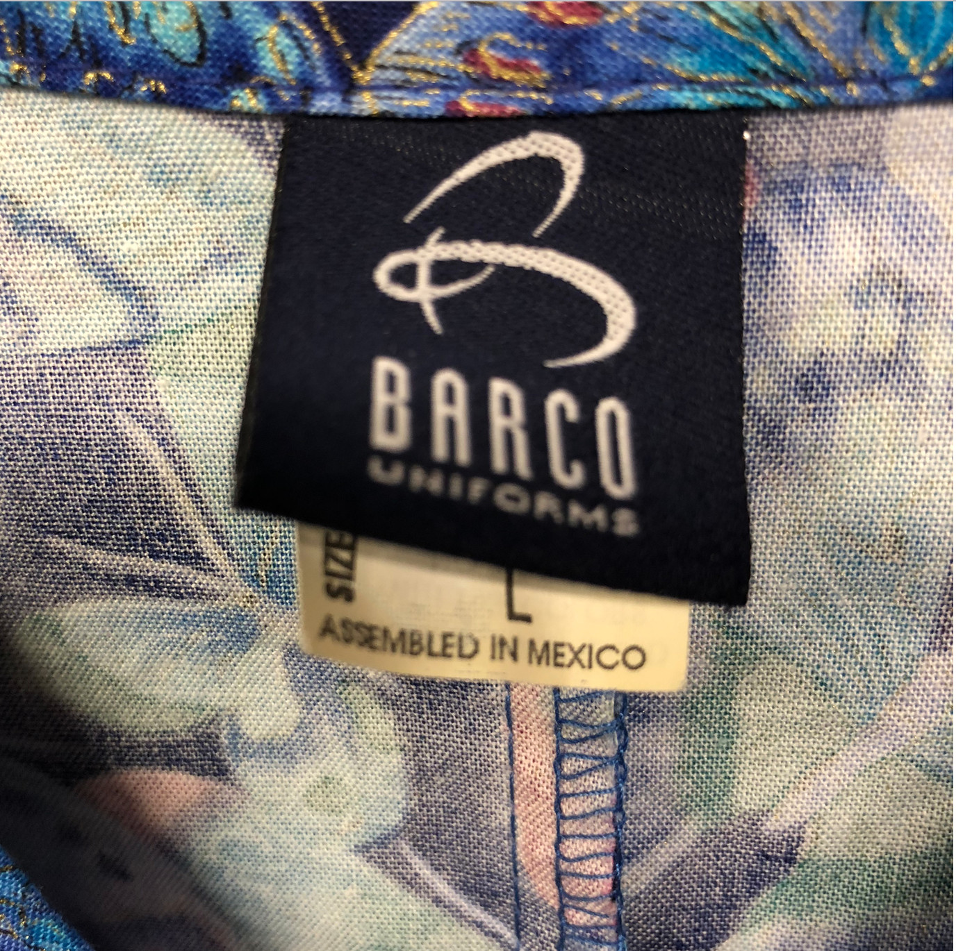 NWOT Barco Uniforms Sz Large Blue Pink Butterfly w/ Gold Flecks Scrub Shirt