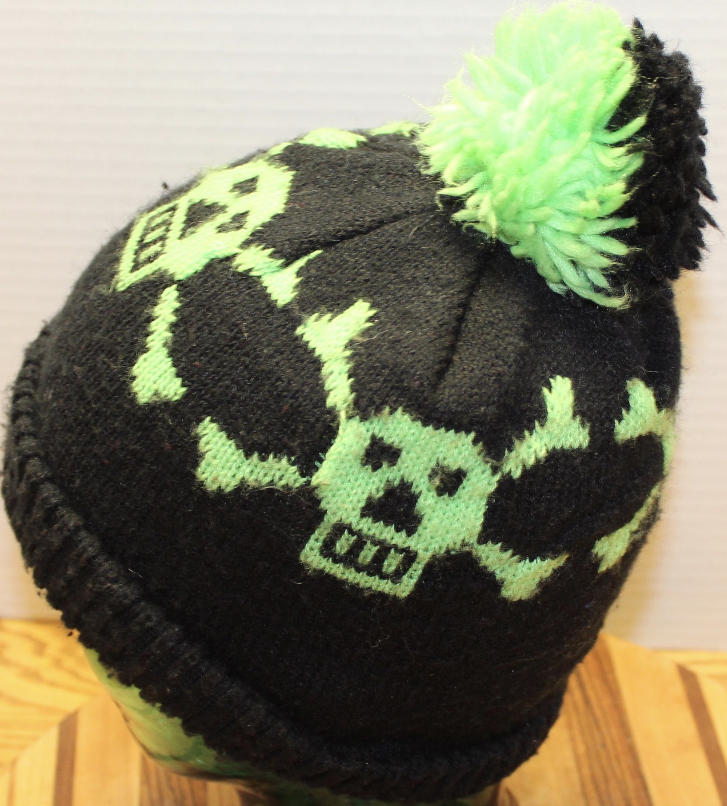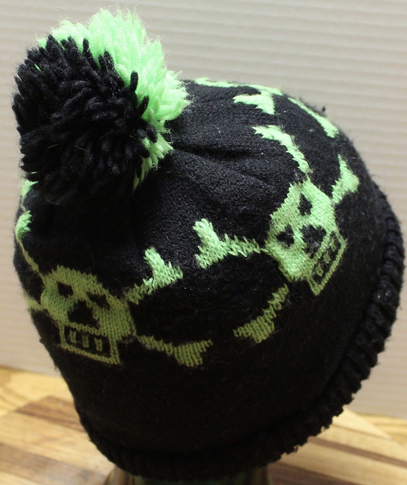 VINTAGE KIDS BLACK SKI HAT WITH SKULLS CROSSBONES GREEN BLACK POM GUC 18