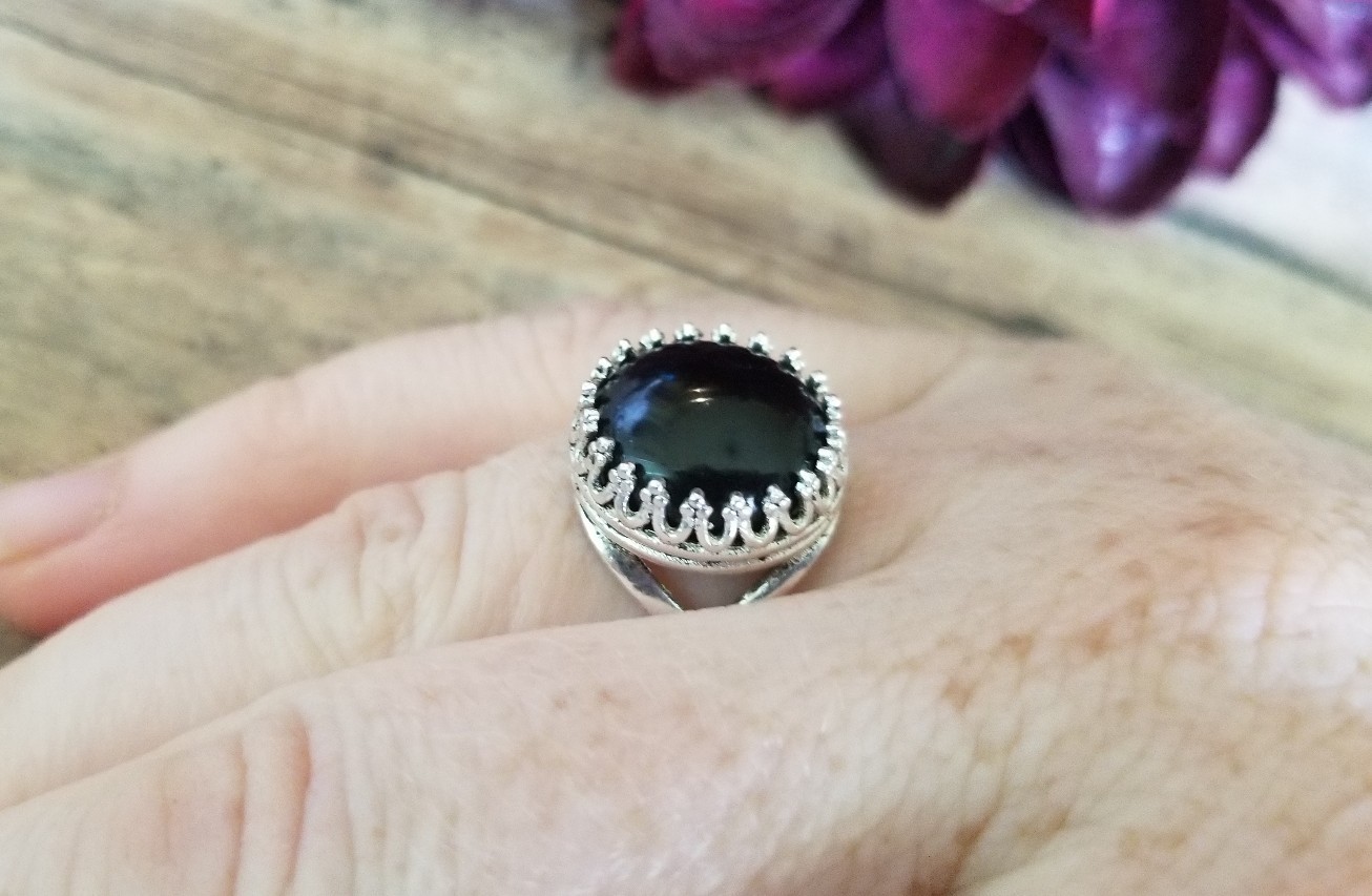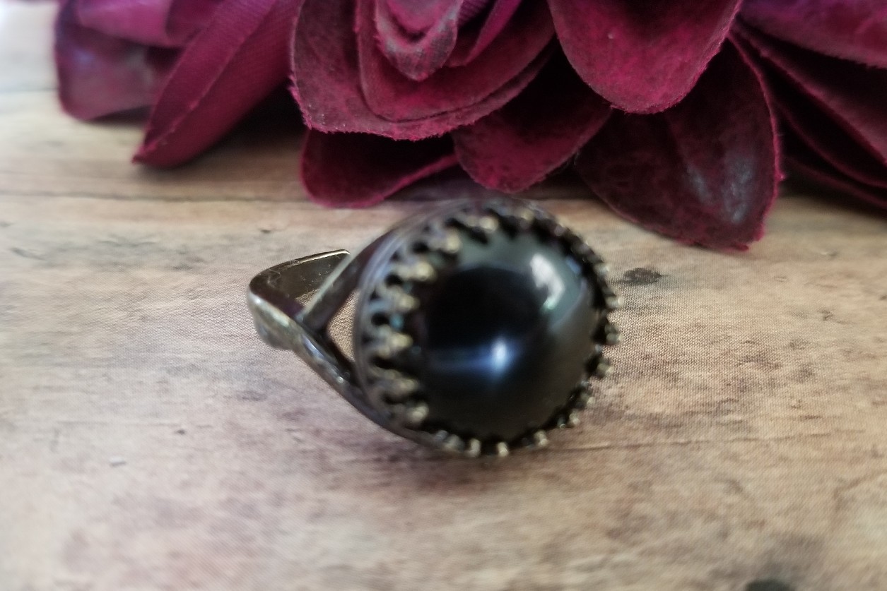 Black agate ring, stone statement, adjustable, bronze, antique style